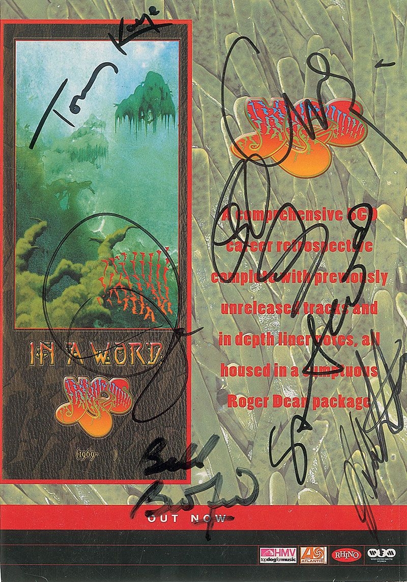 Color 8.25 x 11.75 promotional poster for the In a Word: Yes box set, signed in black felt tip by seven members of the band, including Jon Anderson, Chris Squire, Bill Bruford, Steve Howe, Rick Wakeman, Tony Kaye, and Alan White. In fine condition, with a trimmed right edge.