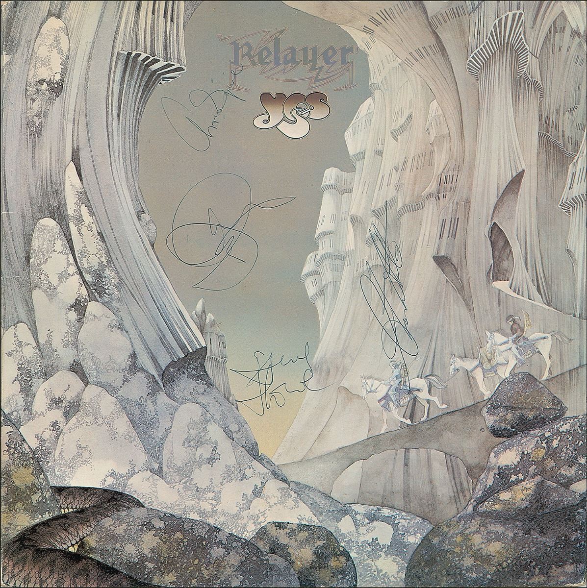 Relayer album signed on the front cover in black ballpoint by Chris Squire, Steve Howe, Alan White, and Jon Anderson, and on the back cover by Patrick Moraz. In fine condition. The record is included. These signatures date to circa 1974–1975 near the time of the album’s release and represent a rare lineup as this was the only album for which Moraz was a member of the band.