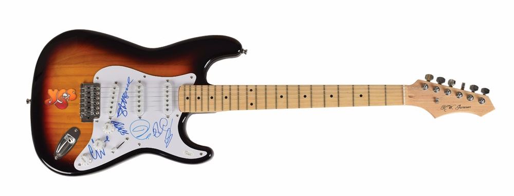 Black-bodied sunburst 'stratocaster-style' R. W. Jameson electric guitar, signed on the white pickguard in blue felt tip by Jon Anderson, Rick Wakeman, Steve Howe, Chris Squire, and Alan White. Body of guitar bears an affixed logo sticker. In fine condition.