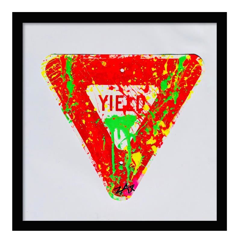 "Yield" is an original hand painted metal street sign by E.M. Zax, hand signed by the artist. This piece comes framed. Includes Letter of Authenticity. Measures approx. 24" x 24" (frame), 16" x 16 (image). The actual paint pattern may vary from the image shown.
