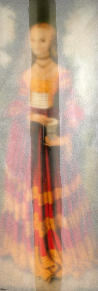 Yigal Ozeri, Israeli Art, B. 1958, Lady with a Cup of Coffee, Hommage to Cranach, 2000, Oil on canvas in a shadow box with silk tissue, 196x76.5cm, Signed. Signed again, dedicated and dated 2004 on the reverse., , Yigal Ozeri, Four Seasons, curator: Mordechai Omer, Tel Aviv Museum of Art, Tel Aviv, 2006, p. 161, illistrated., , ,