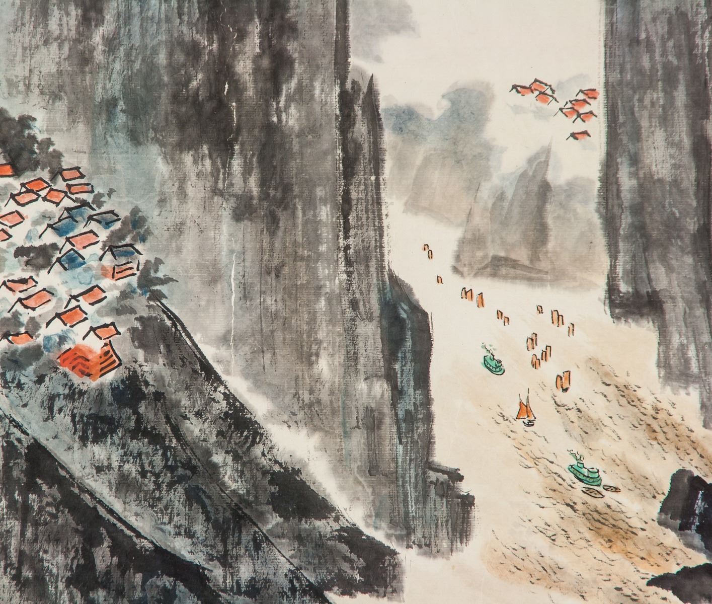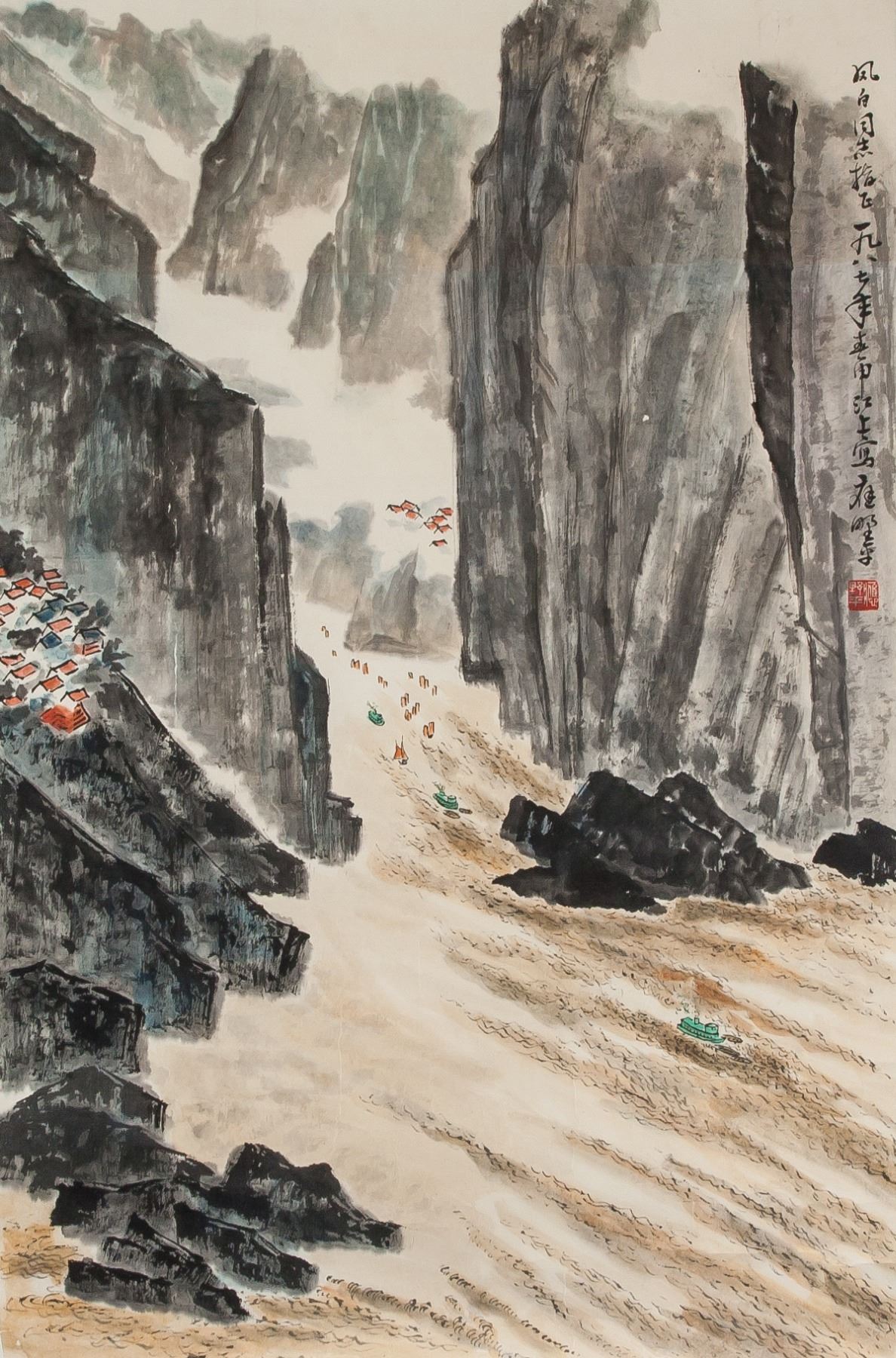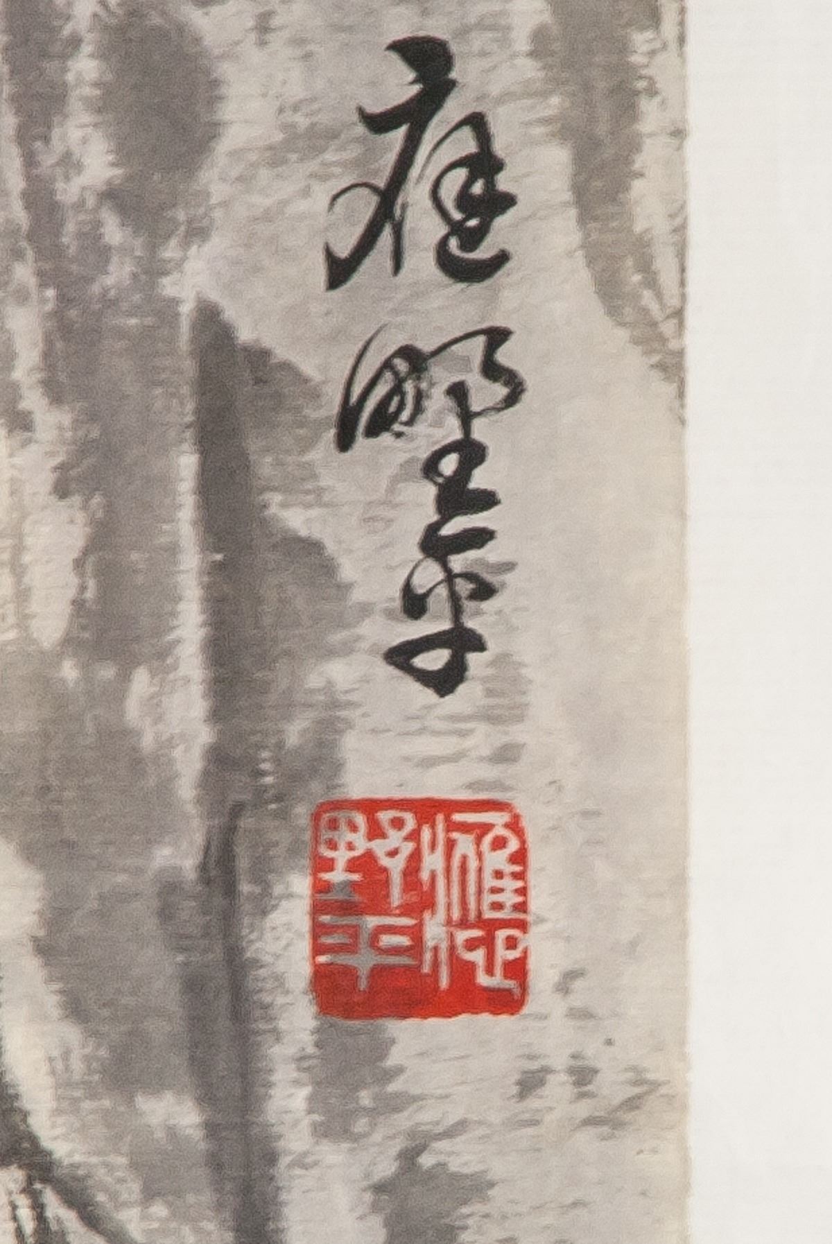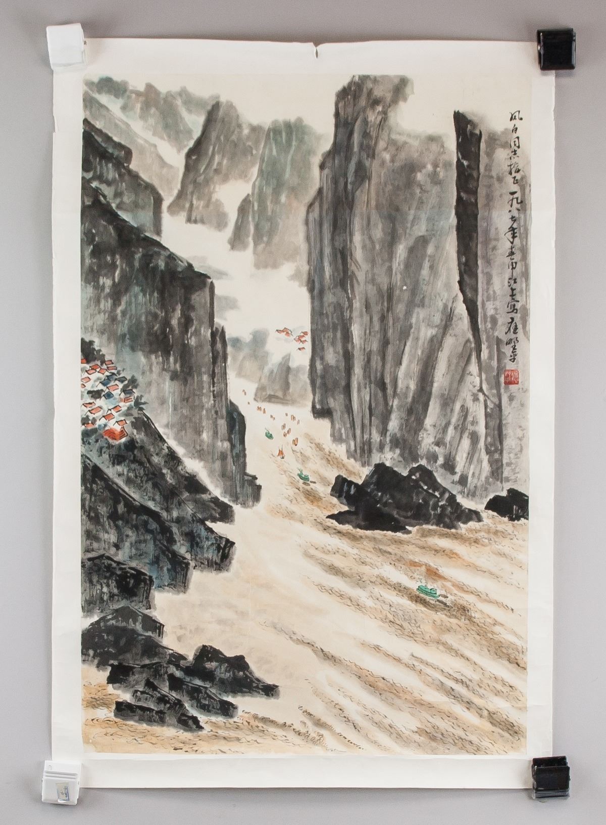 Ink and watercolor on paper roll. Featuring mountainous landscape. Signed Ying Yeping 1910-1990 Chinese, inscribed with 1 artist seal. 70 x 46 cm.