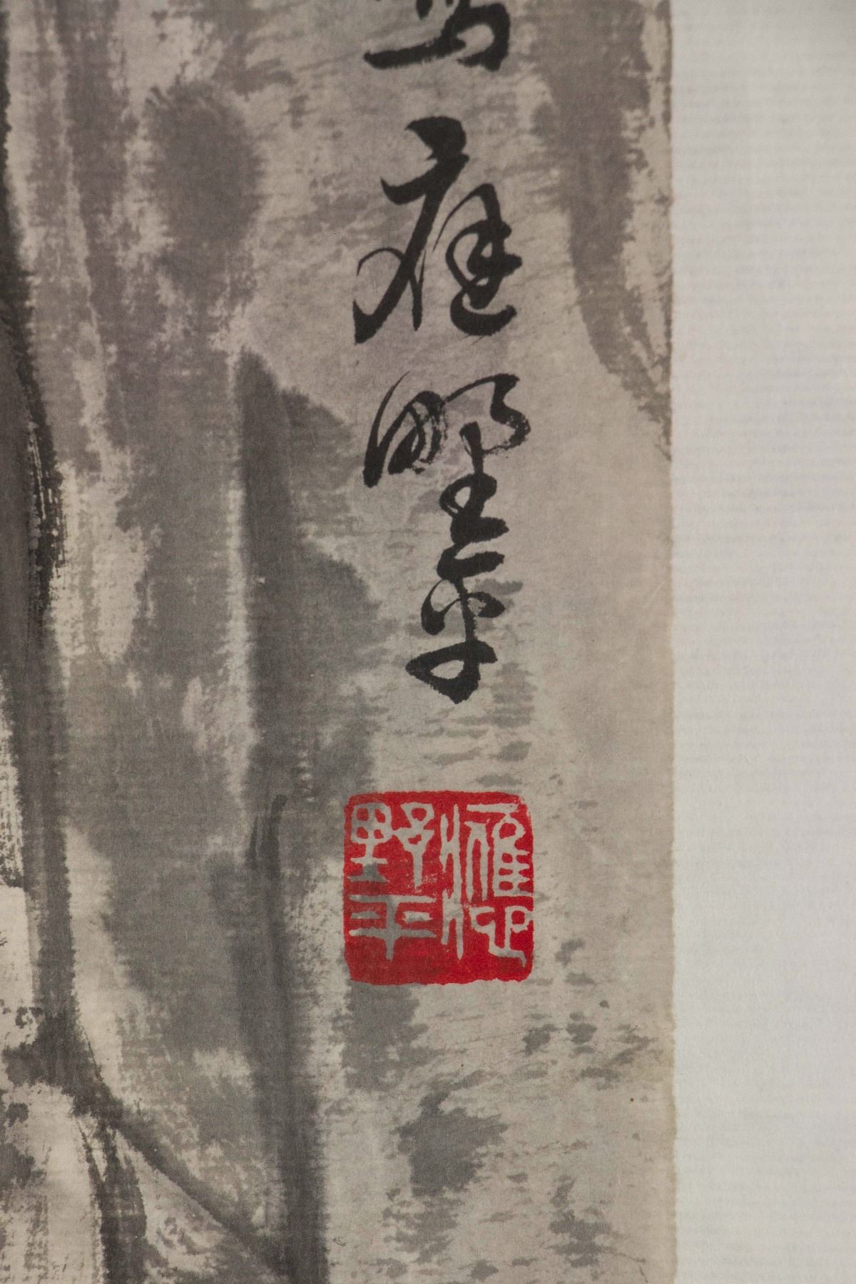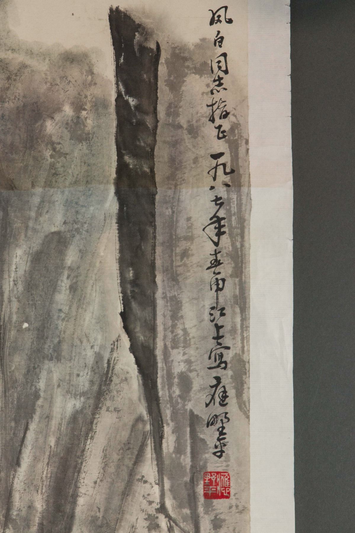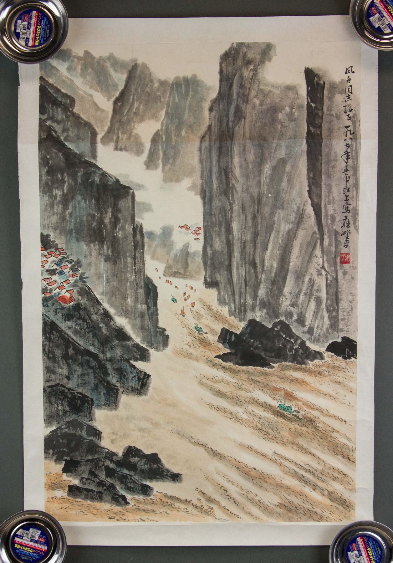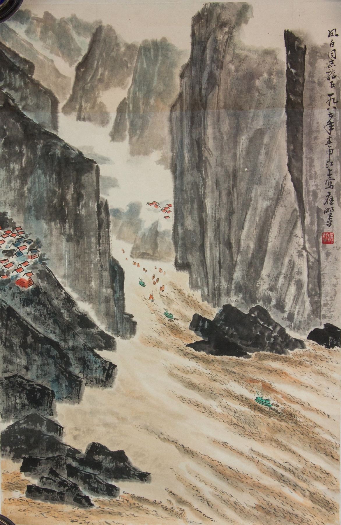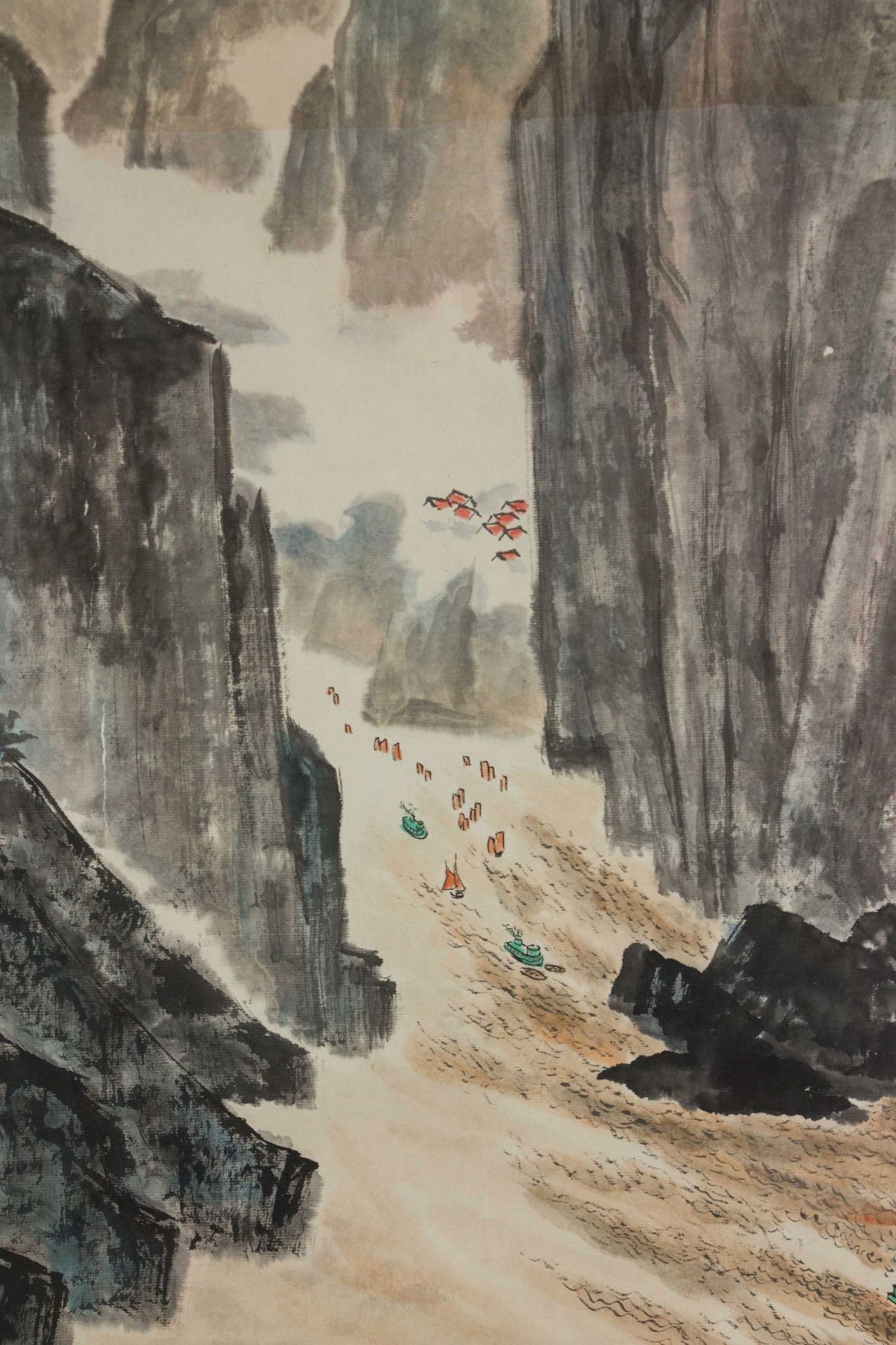 Mountainous landscape with river, boats and village; Chinese ink and watercolour on paper roll; signed Ying Yeping (1910-1990); inscribed with 1 artist seal; 70 cm x 46 cm