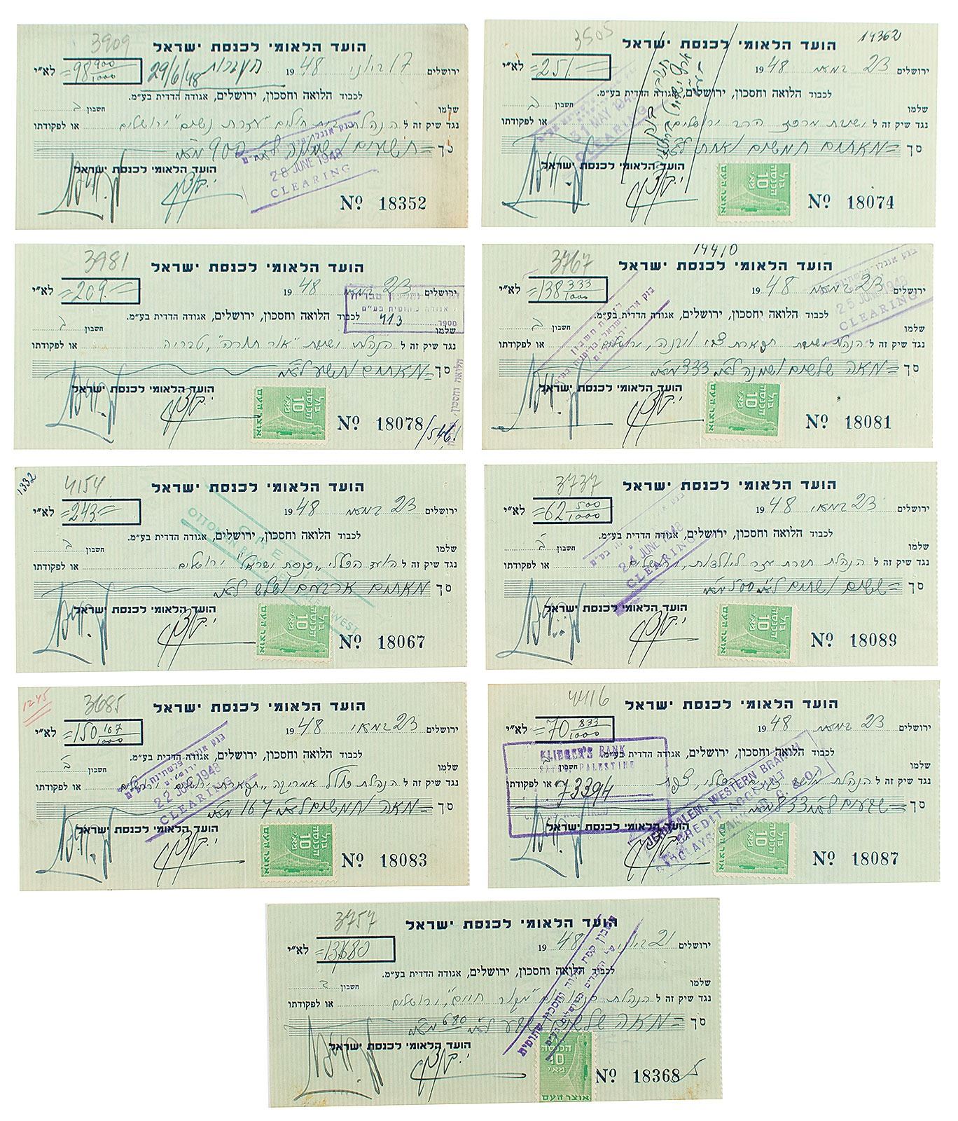 Group of nine checks in Hebrew, each 6 x 2.75, dated to 1948, each filled out in another hand and signed in black ink by Yitzhak Ben-Zvi. In overall fine condition.