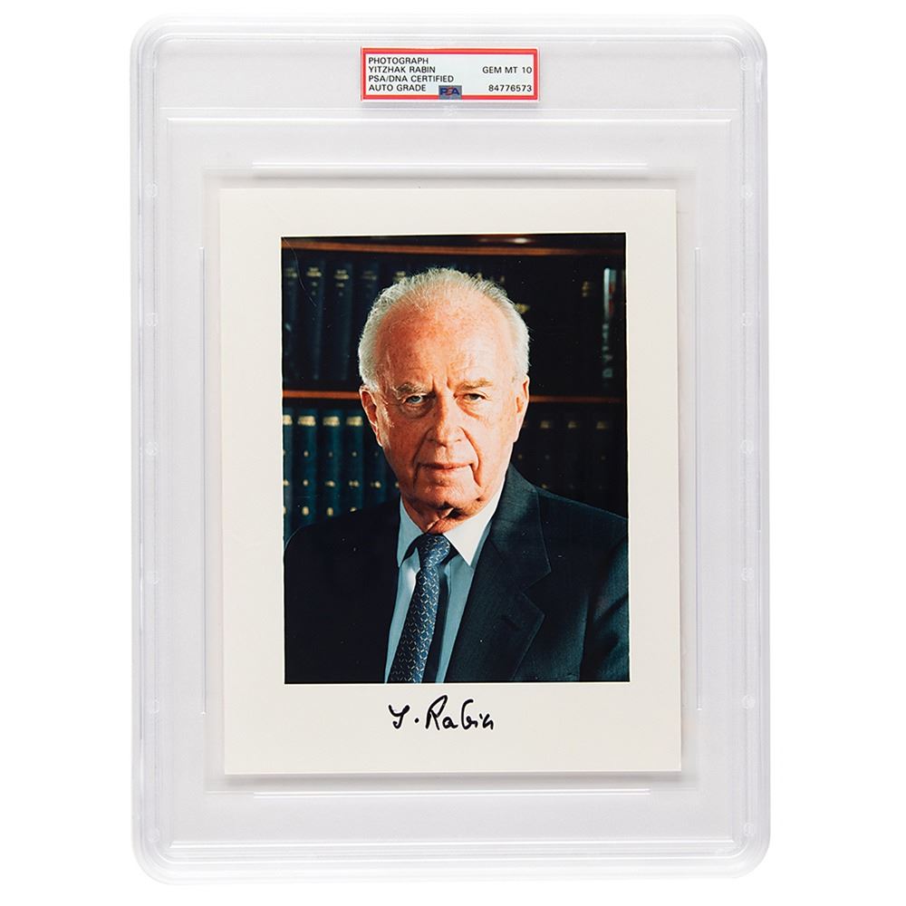 Color glossy 7 x 9 head-and-shoulders photo of the Israeli prime minister, signed in the lower border in black felt tip, "Y. Rabin." In fine condition, with some light creases in the borders. Encapsulated and graded by PSA/DNA as "GEM MT 10."
