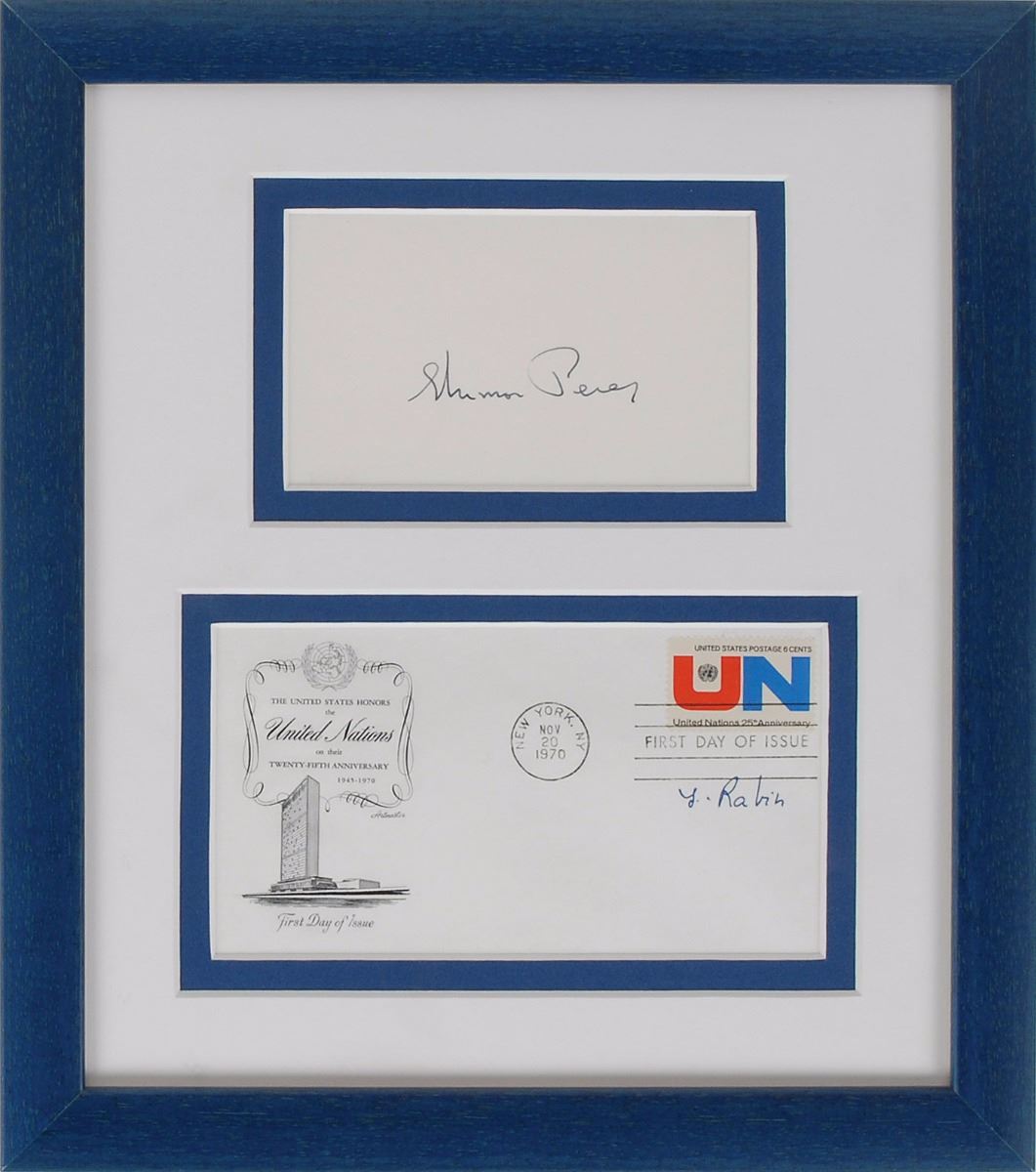 Two items: an FDC with a cachet honoring the United Nations, signed in blue felt tip, “Y. Rabin”; and an ink signature, “Simon Peres,” on a white card. Matted and framed together to an overall size of 10.75 x 12. In fine condition.