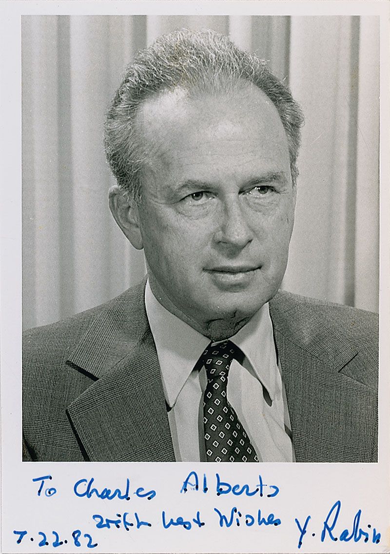 Vintage glossy 3.5 x 5 photo of Rabin in a suit and tie, signed and inscribed in fountain pen, “To Charles Alberts, with best wishes, Y. Rabin, 7-22-82.” In fine condition.