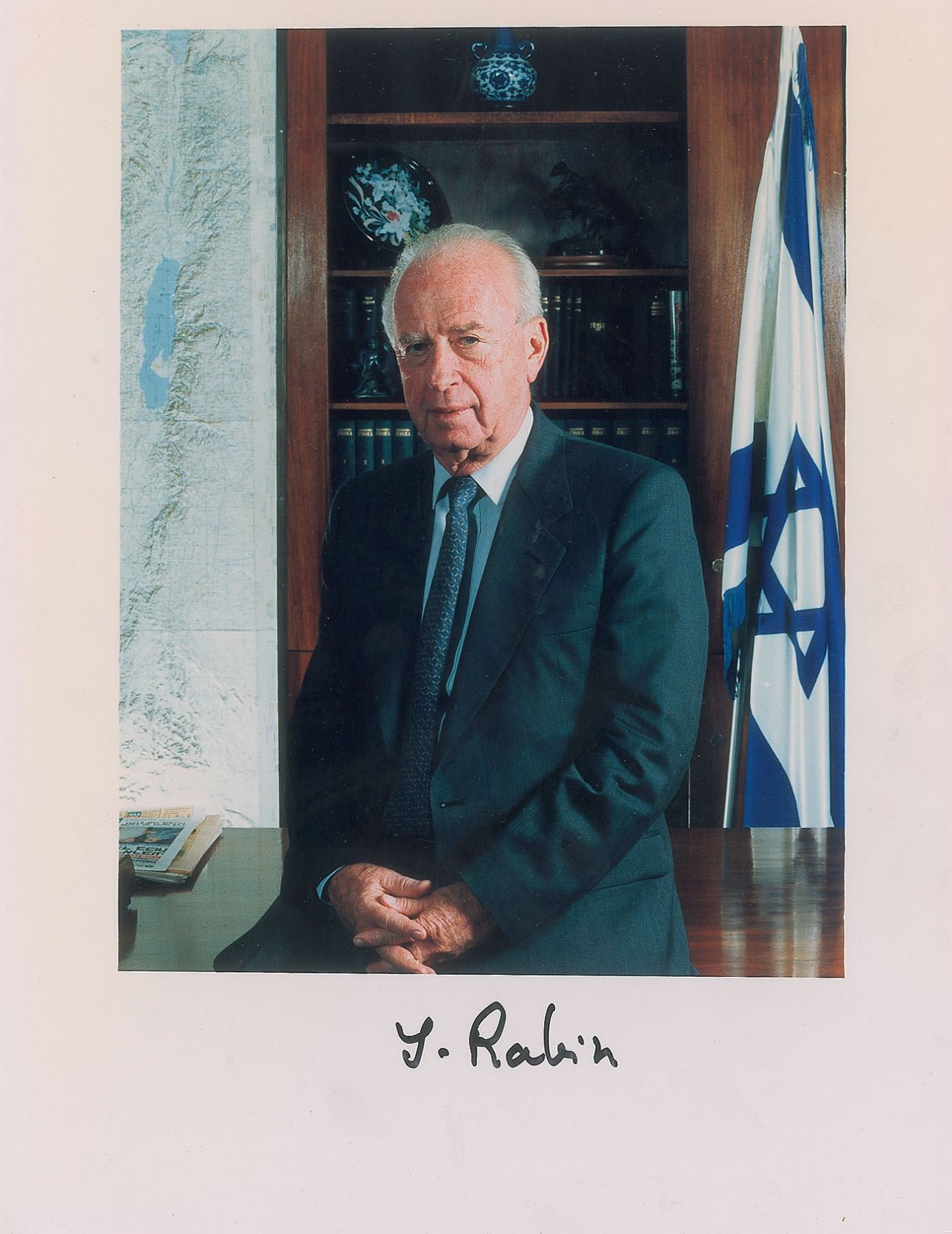 Color glossy 7 x 9 photo of Rabin as prime minister of Israel with his nation's flag in the background, signed in the lower border in black felt tip, "Y. Rabin." In fine condition.