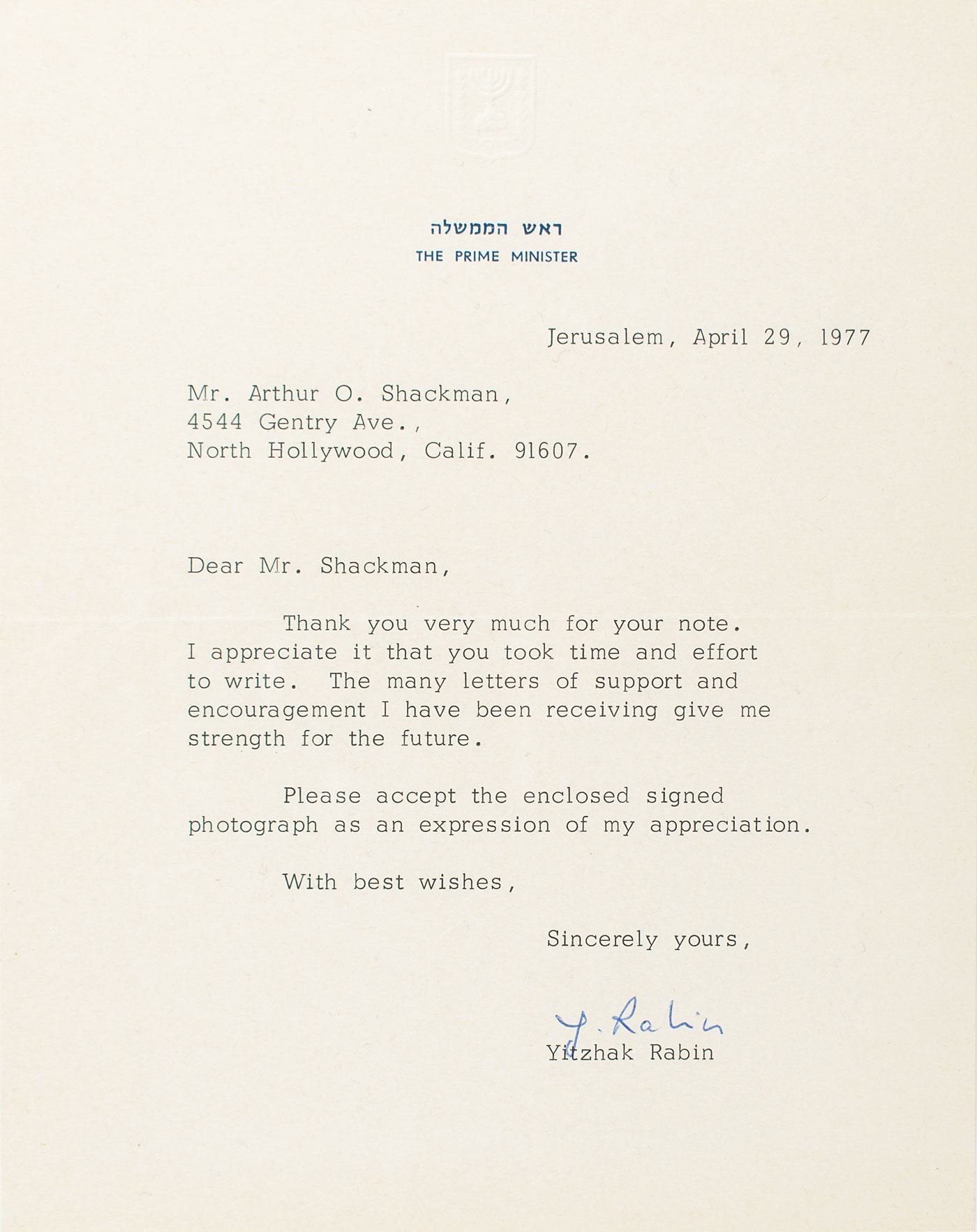 TLS signed “Y. Rabin,” one page, 6.5 x 8.25, The Prime Minister letterhead, April 29, 1977. Letter to Arthur O. Shackman, in part: "Thank you very much for your note. I appreciate it that you took time and effort to write. The many letters of support and encouragement I have been receiving give me strength for the future." In fine condition. Rabin resigned as prime minister on April 8, 1977, in the wake of reports that he and his wife held two bank accounts in Washington; according to Israeli currency regulations at the time, it was illegal for citizens to maintain foreign bank accounts without prior authorization.