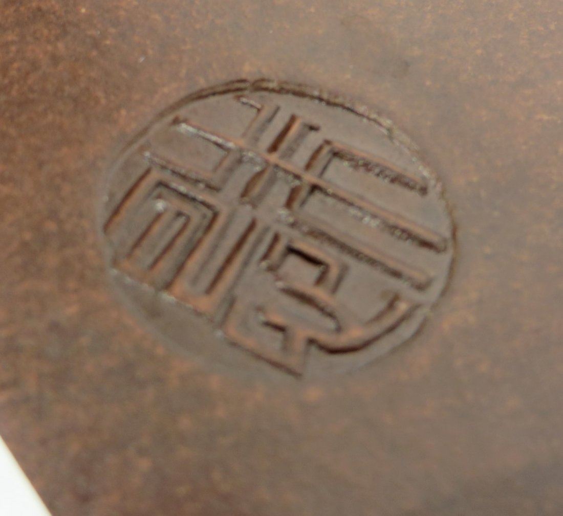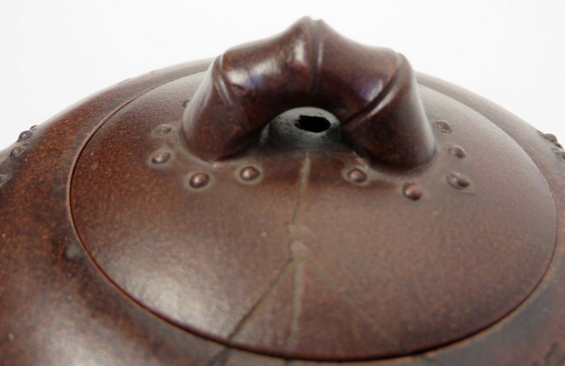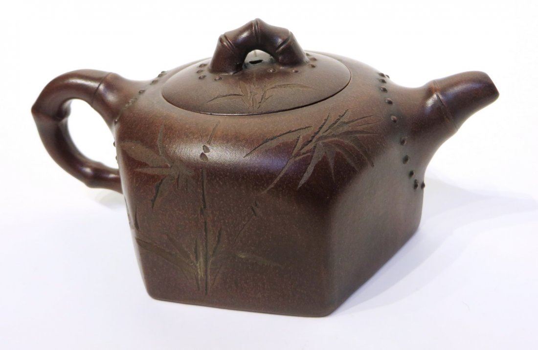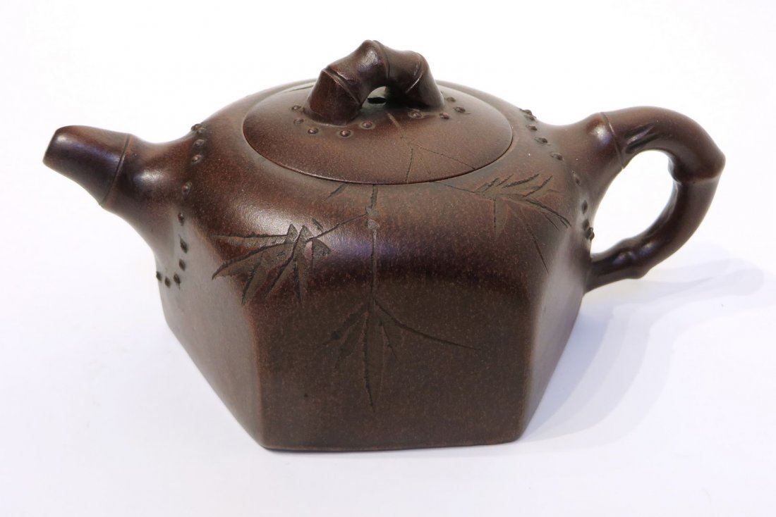 Terra cotta bamboo patterned tea pot, incised with a design of bamboo on the front and back. The handle and spout shaped like bamboo. Marked on the bottom.