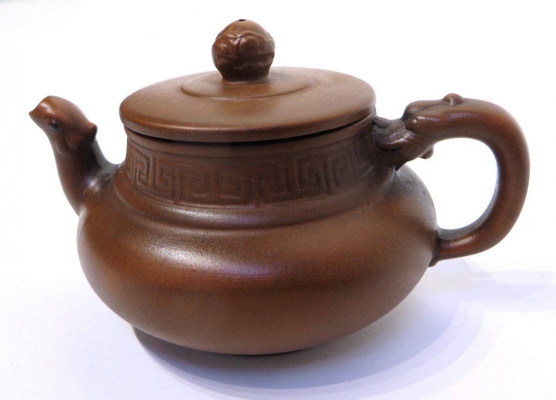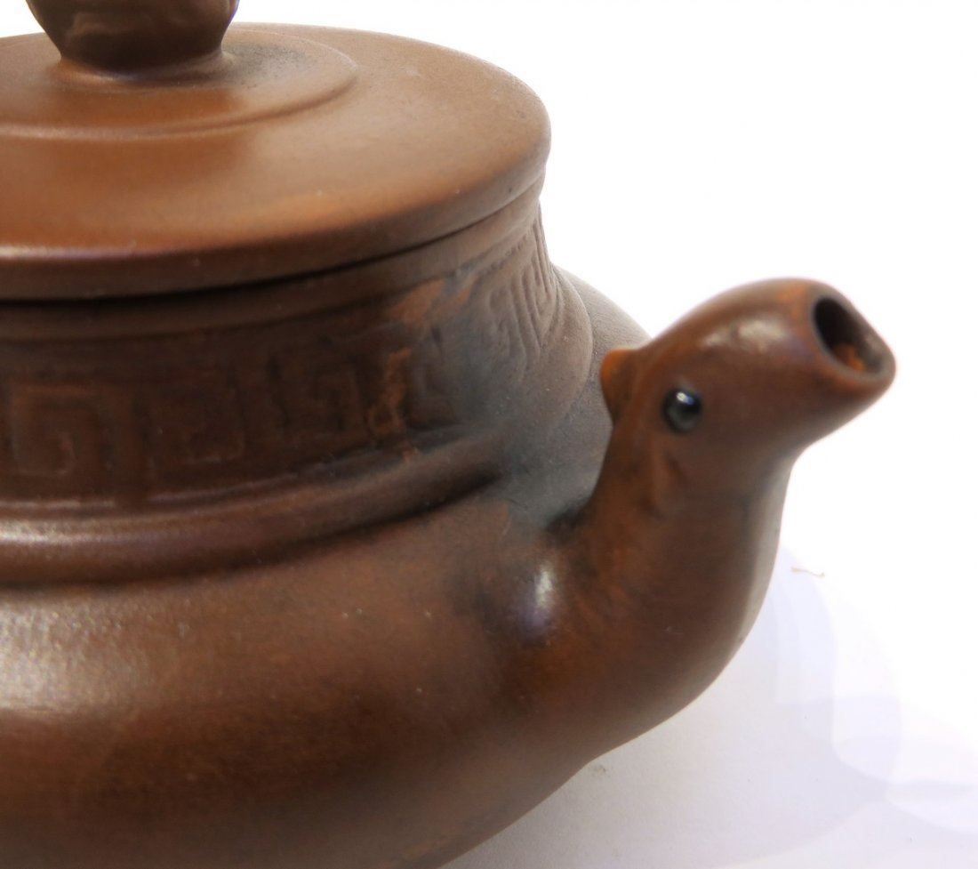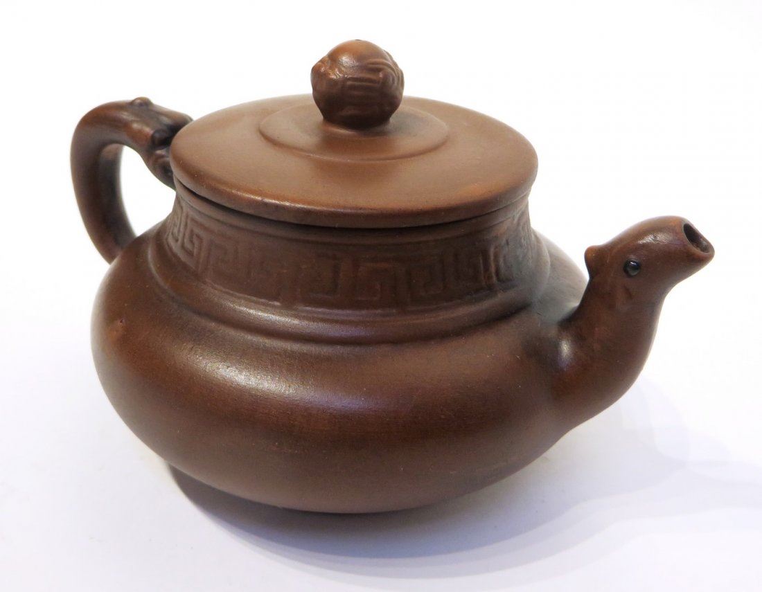 Terra cotta tea pot with animal form handle and spout, a meander patter around the top, and marked on the bottom.