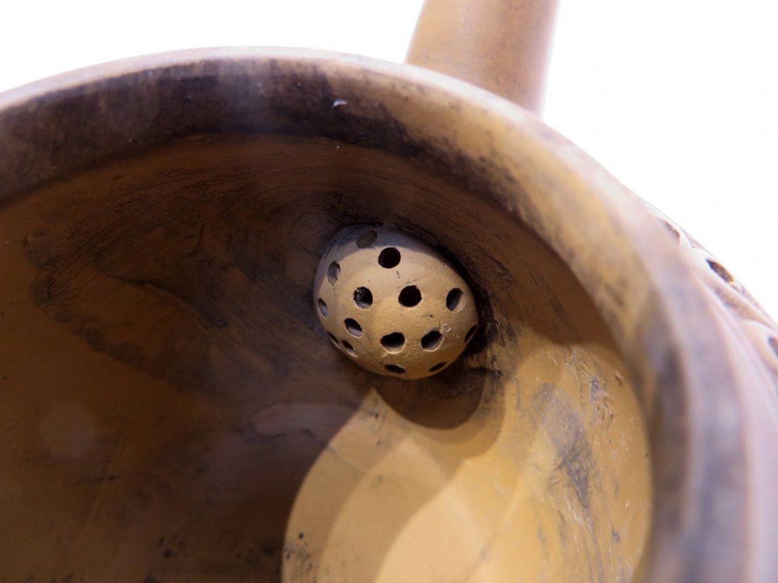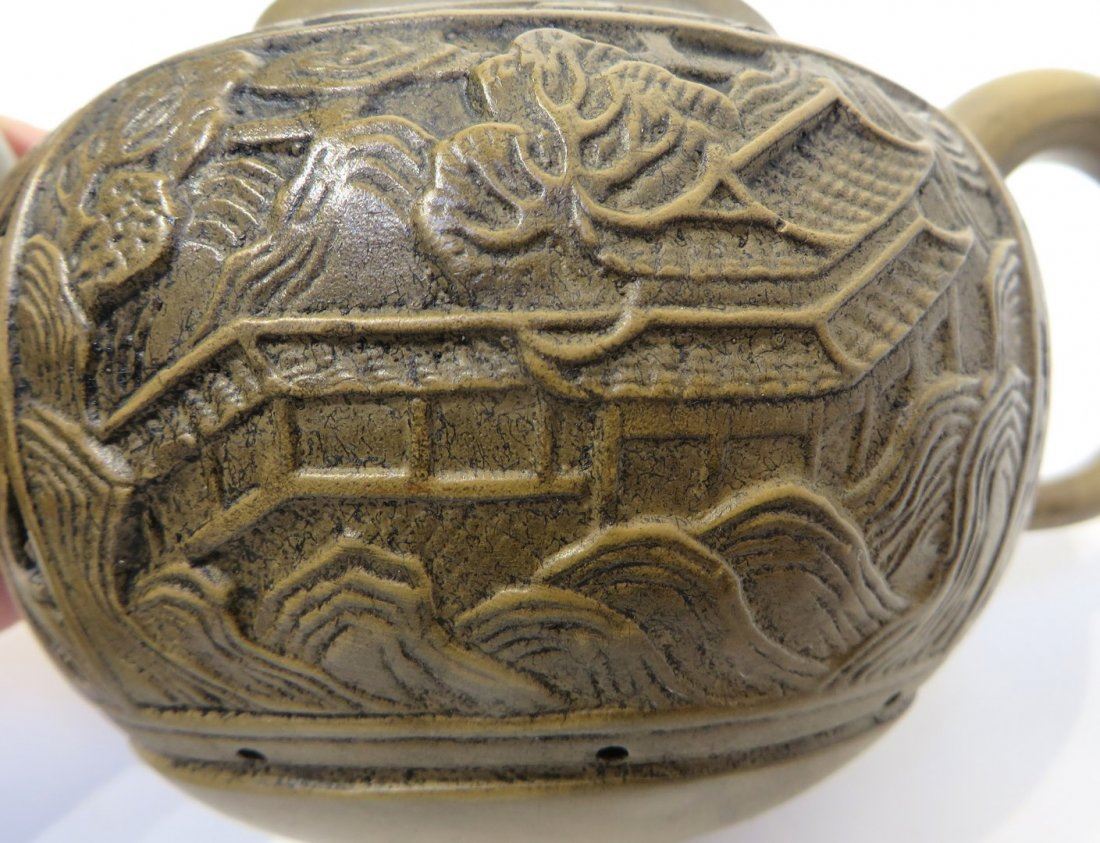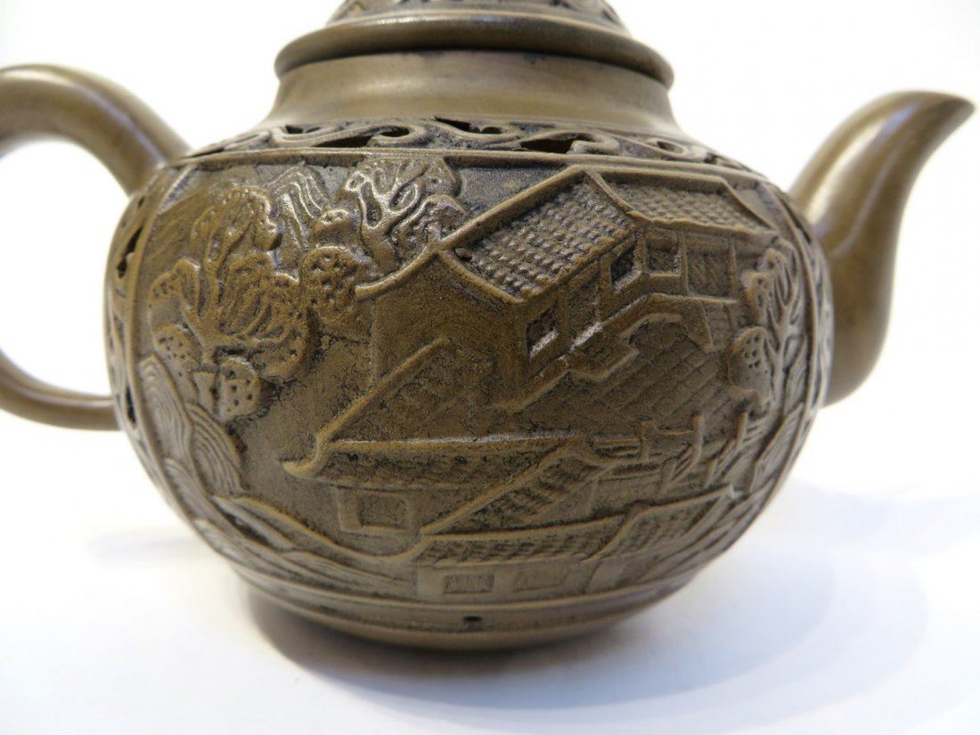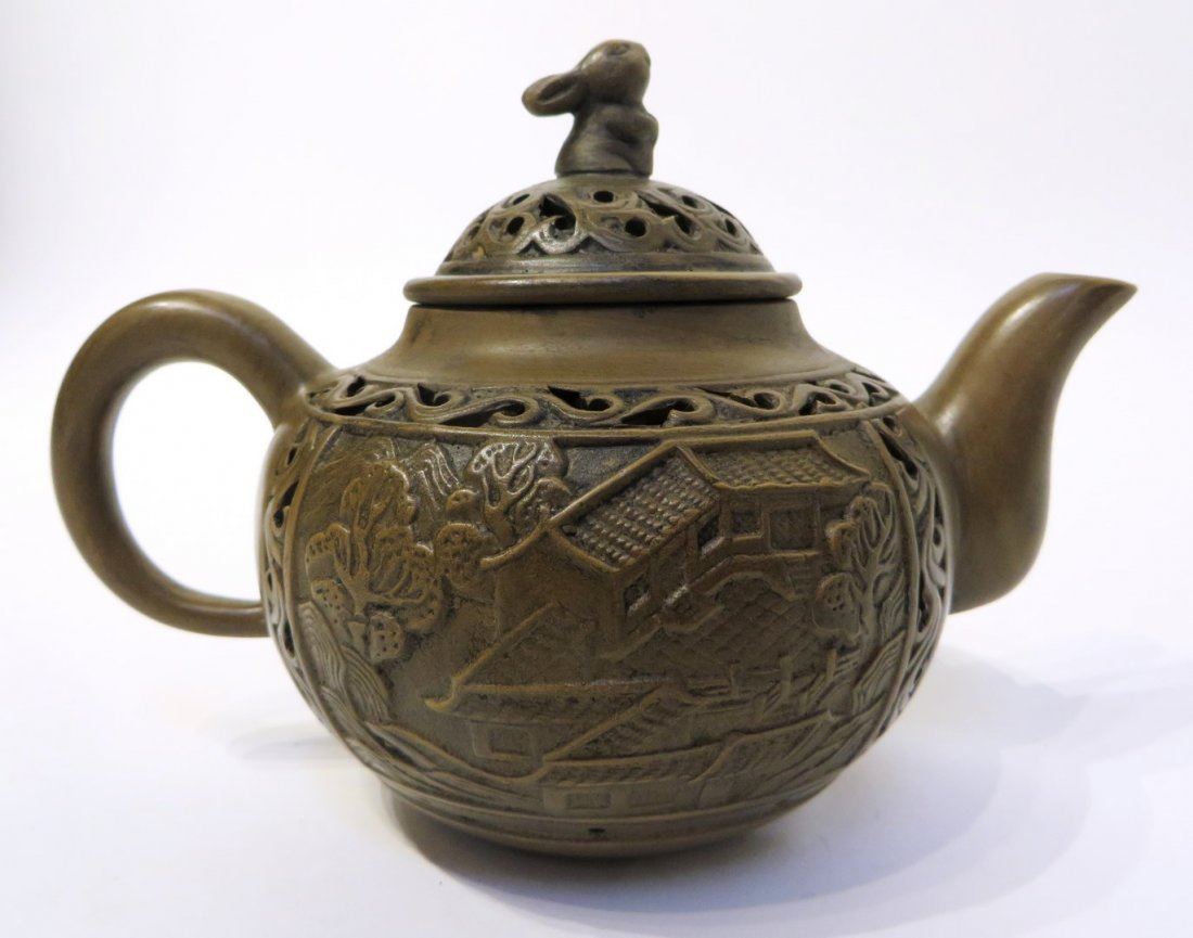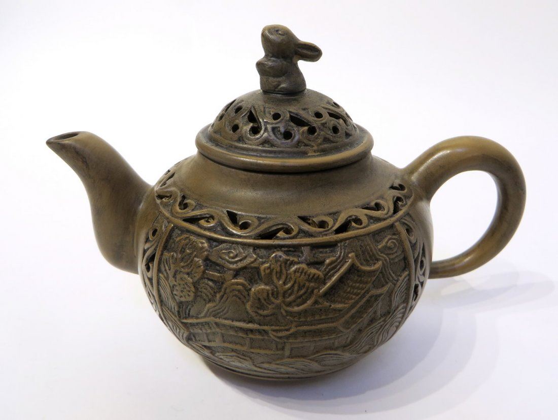 A terra cotta tea pot with pierced patterns and a rabbit on the lid. The front and back have village scene carvings. The inside has a built-in clay strainer. Marked on the bottom in an inset. NO RESERVE! ! Most items in this sale have no reserve