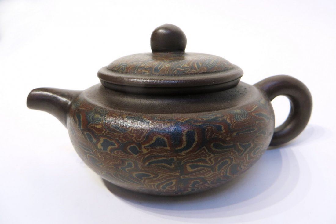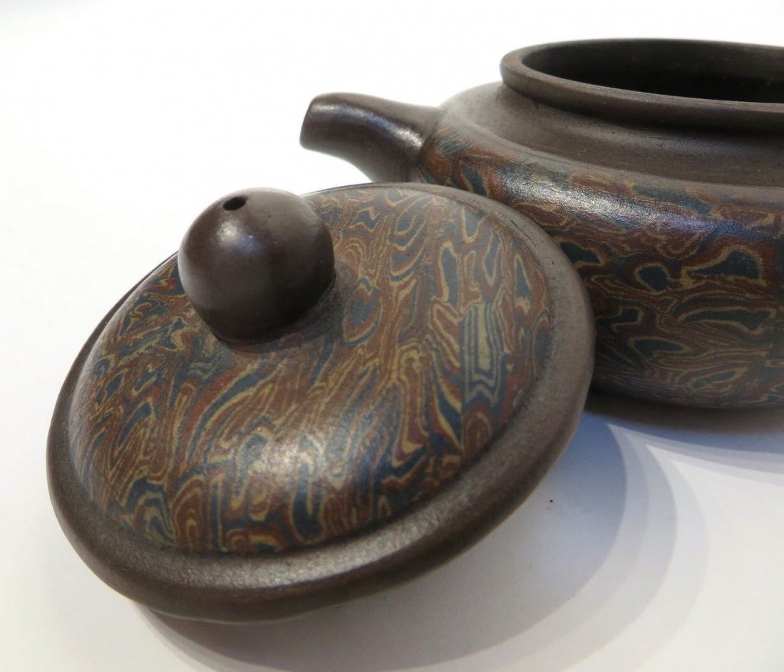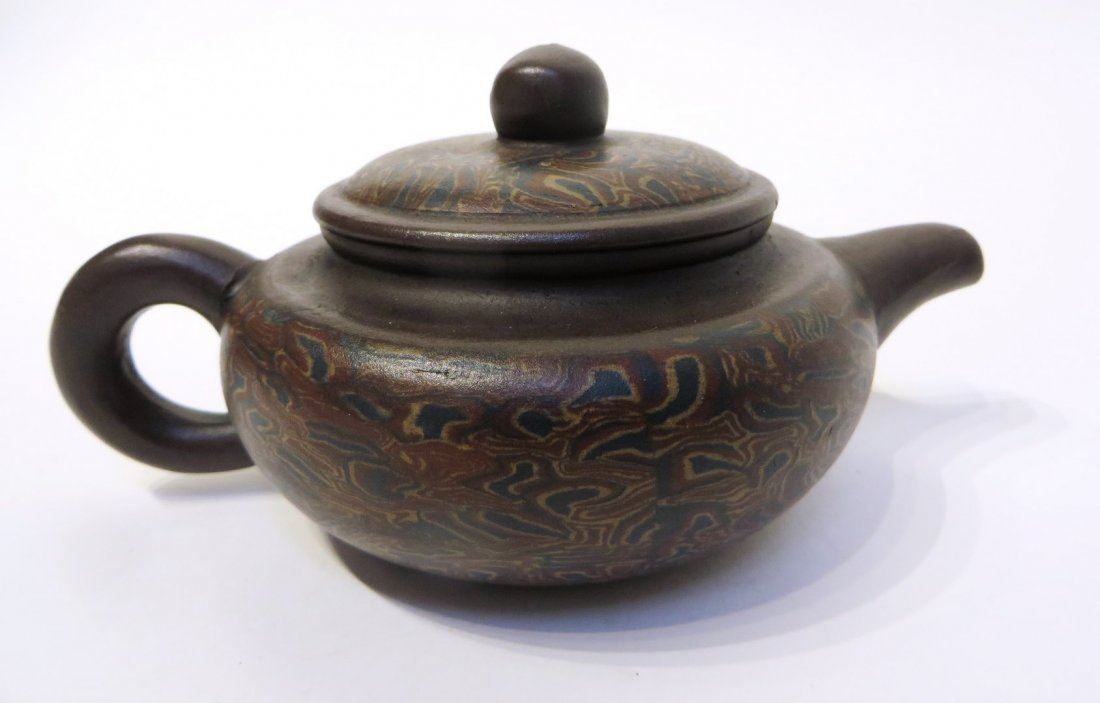 Terra cotta tea pot with patterns resembling marble. Marked on the bottom.