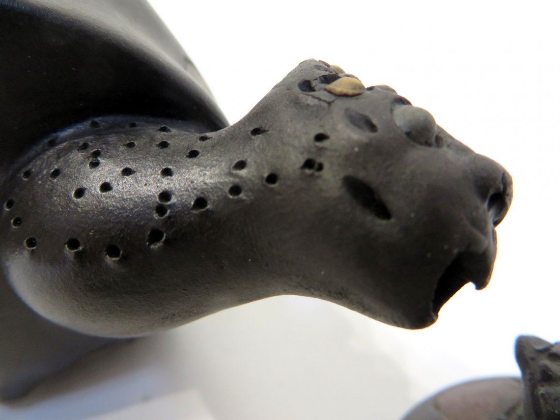 The spout is the turtle's head, the feet show turtle toenails, the lid is a tiny turtle riding the other's back. Marked on the bottom and base of handle.