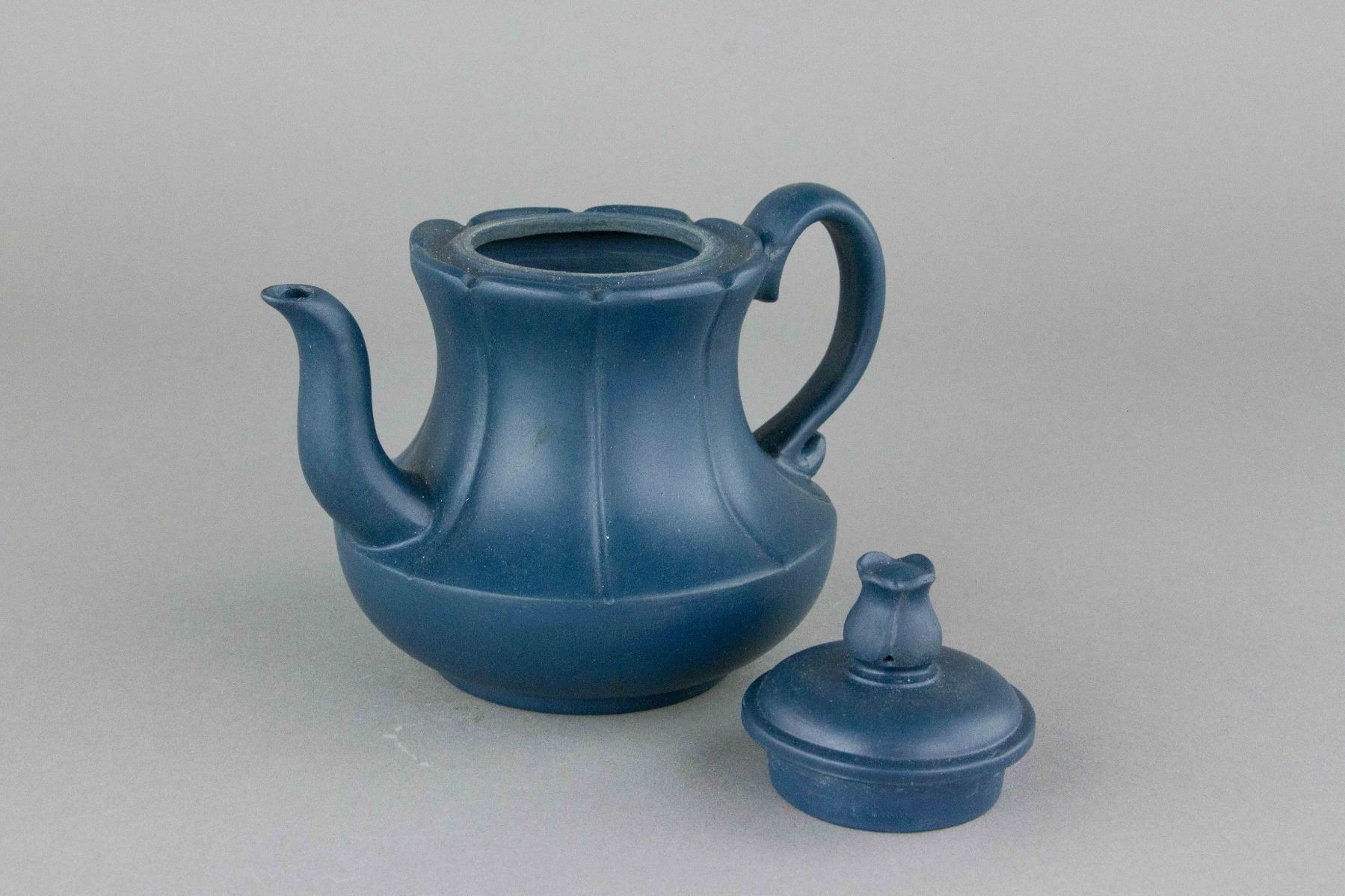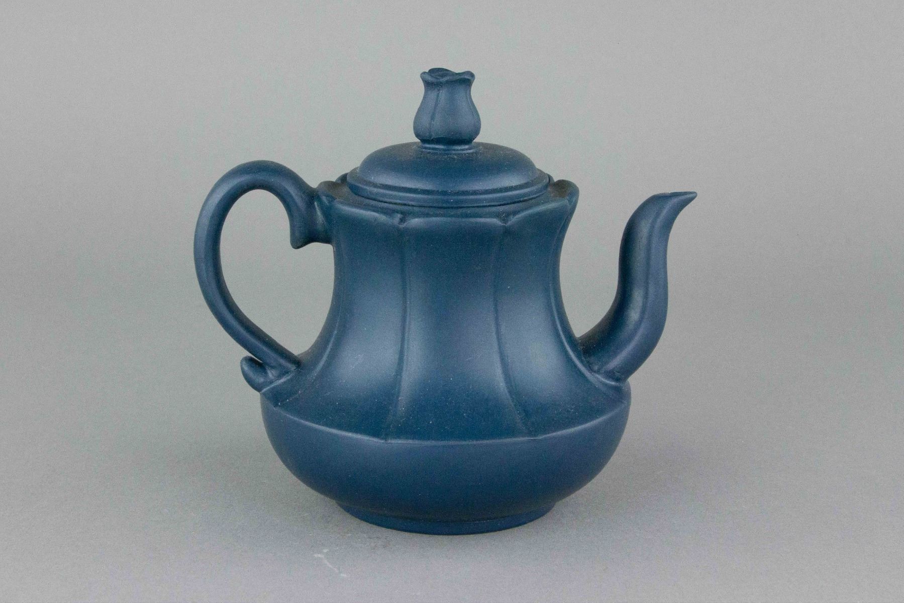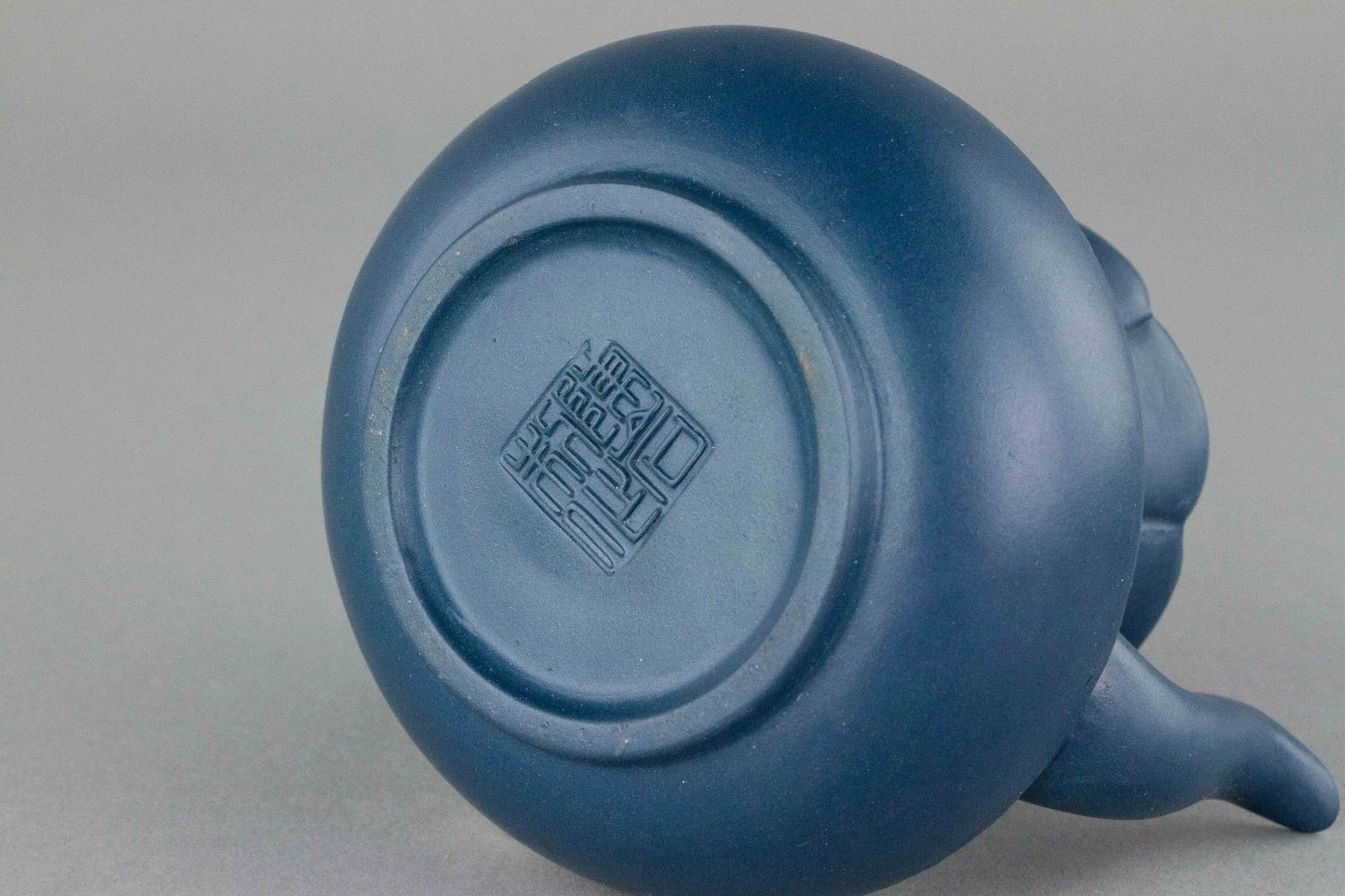 Chinese Yixing blue Zisha teapot with cover; of compressed globular body with eight-lobed waisted neck; four-character artist Chen Yan mark on base; H: 11 cm, D: 13 cm, 193 grams