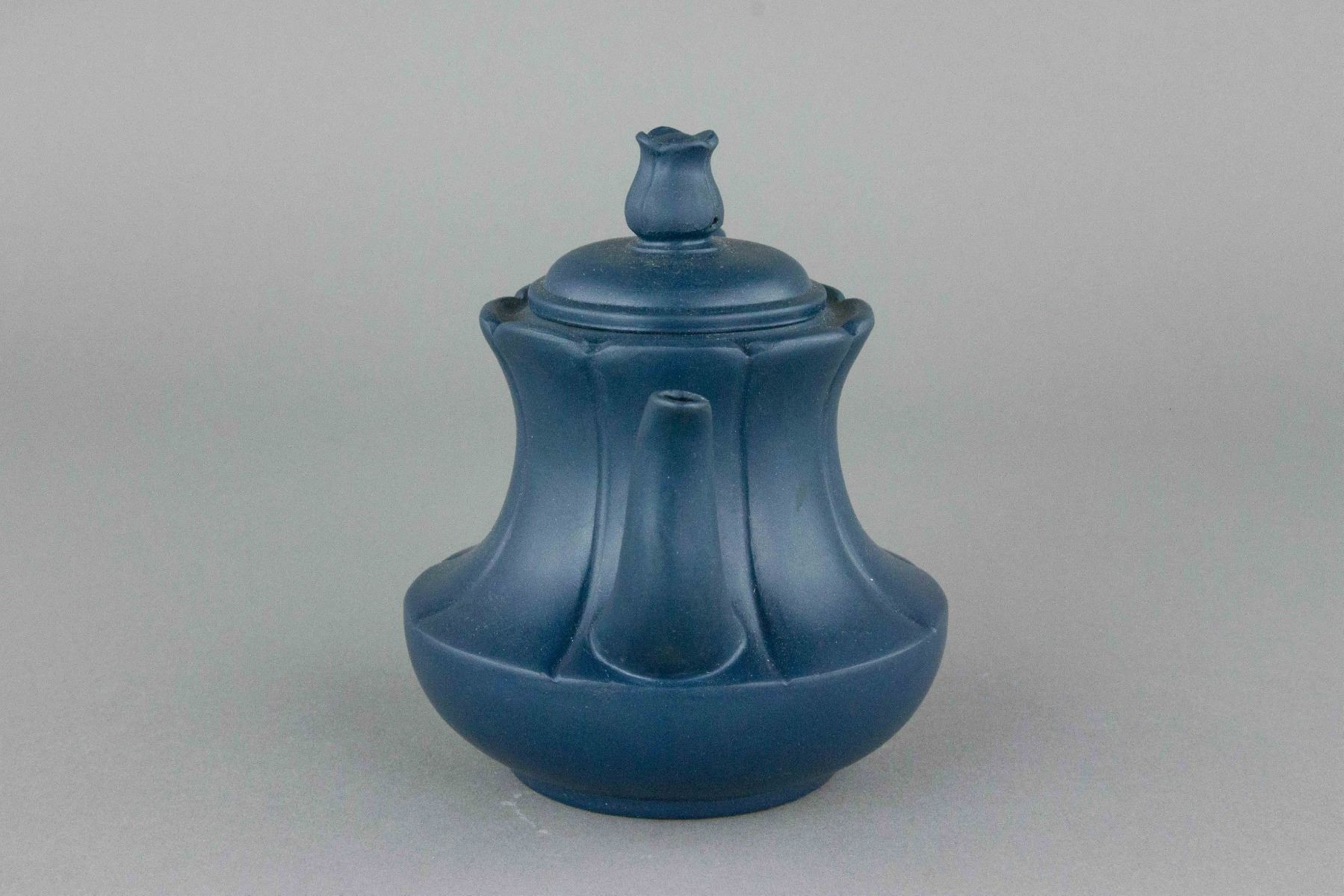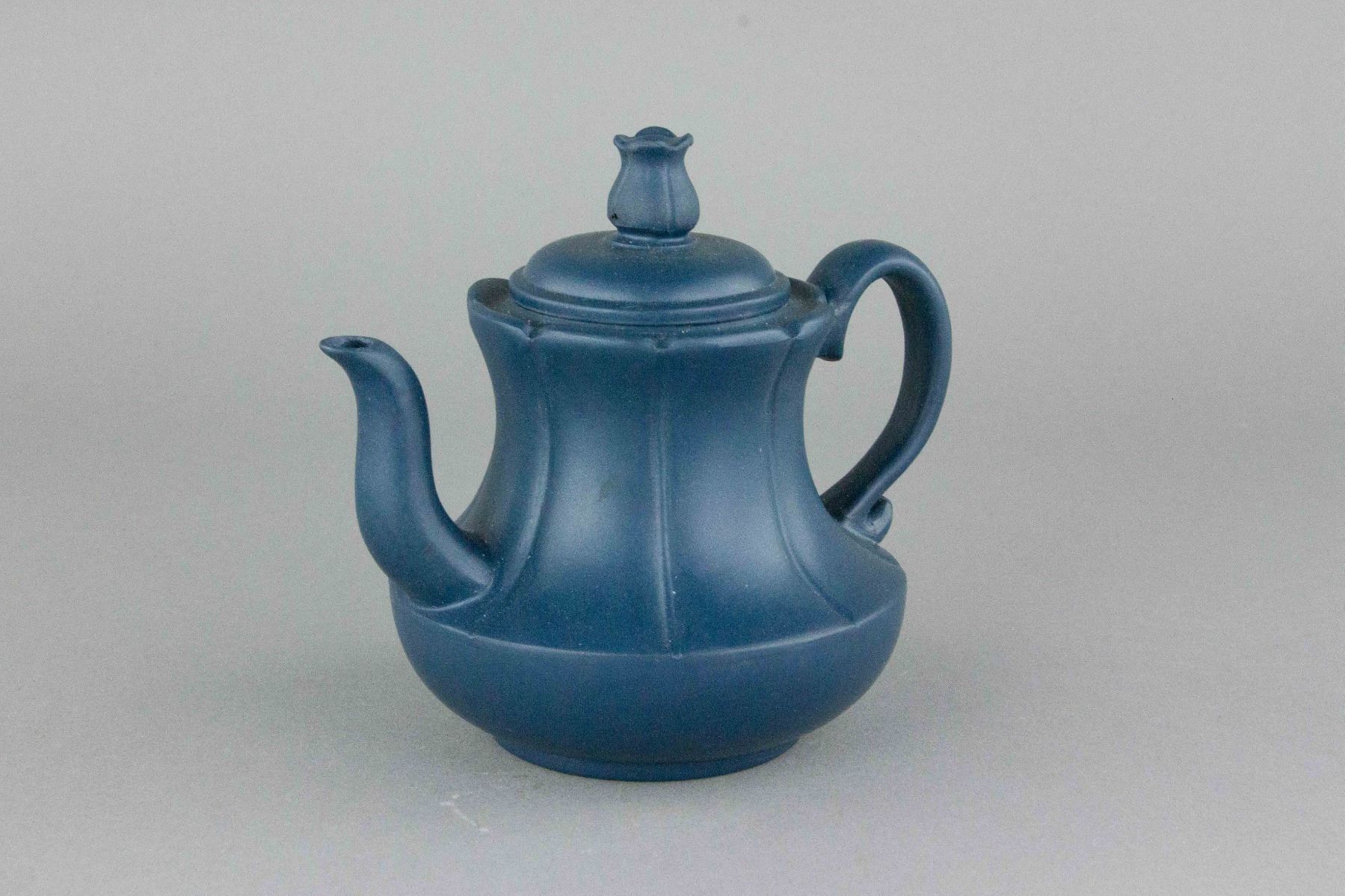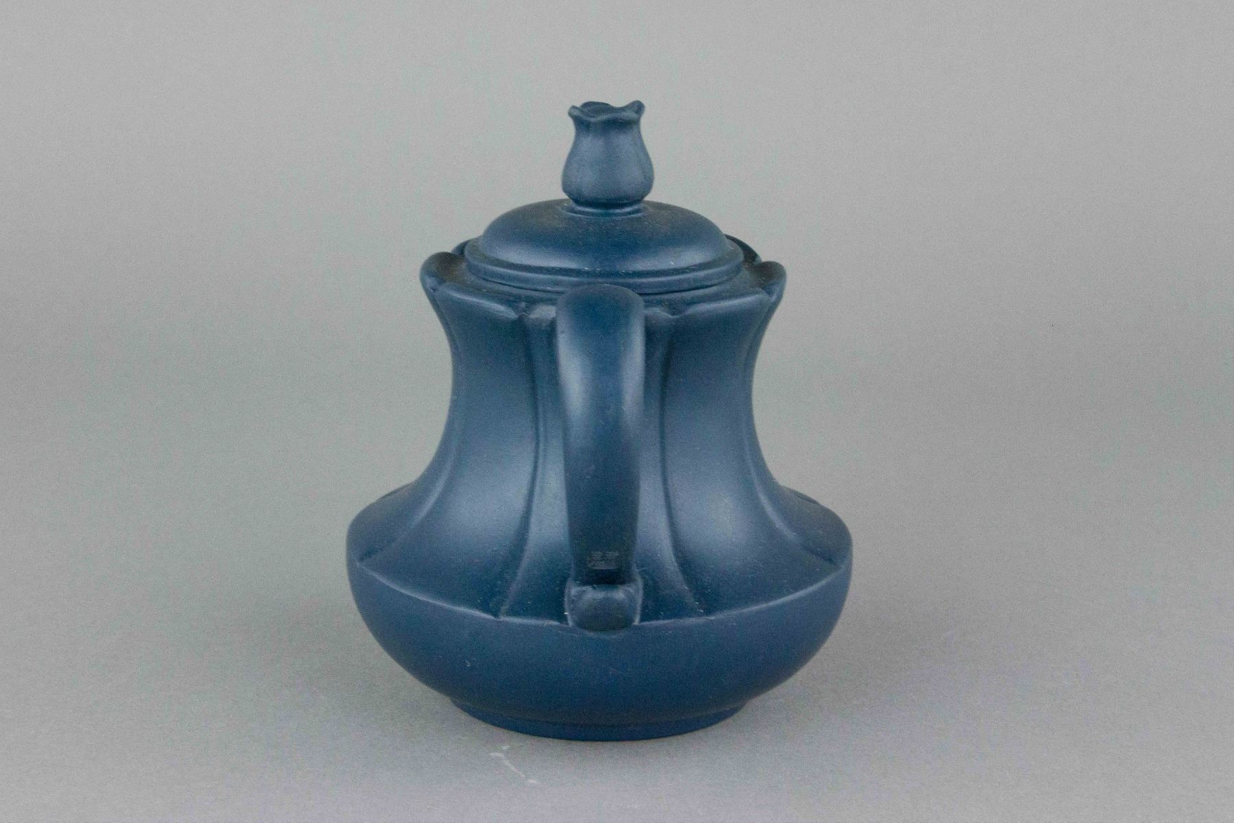 Chinese Yixing blue Zisha teapot with cover; of compressed globular body with eight-lobed waisted neck; four-character artist Chen Yan mark on base; H: 11 cm, D: 13 cm, 193 grams