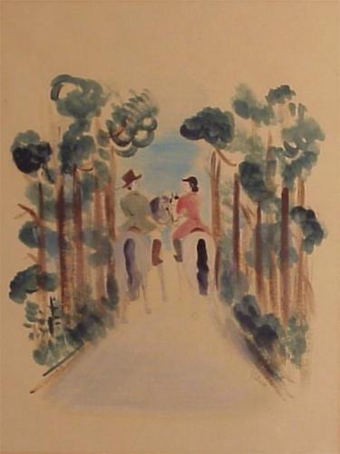Yliane Labaudt (20th Century) daughter of Lucien COUPLE RIDING HORSES, gouache on paper, 21 x 16", signed lower right, discardable frame with glass, mat staining and toning.