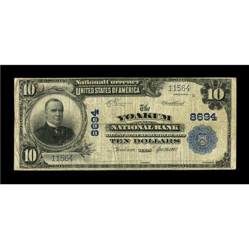 <B>Yoakum, TX</B></I> - $10 1902 Plain Back Fr. 626 <B>The Yoakum NB</B></I> Ch. # 8694<BR>In 2004 we saw a 1902 $10 PB in a similar grade on this bank go for almost $1800. <B>Fine,</B></I> the signatures faded.<BR><BR><b>Shipping:</b> Coin/Currency (<a target="_blank" href="http://www.heritageauctions.com/common/shipping.php">view shipping information</a>)