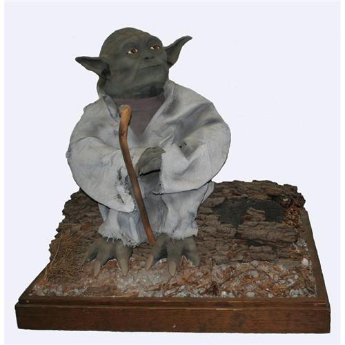 Model Yoda of Star Wars fame.  Oral history of this item states it to be a prototype for the original Yoda.  Base is approximately 25" x 28" with the overall height of Yoda who is perched on a log 28" T.