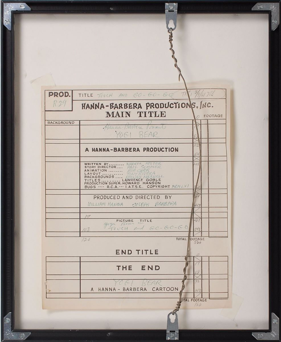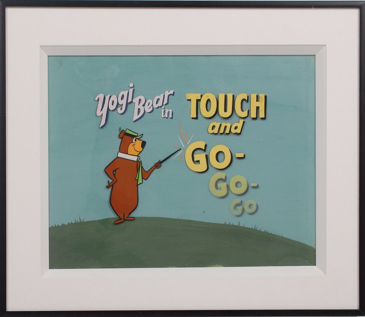 (Hanna-Barbera Studios, 1961) Rare original production key master background set-up featuring Yogi Bear from The Yogi Bear Show, showing Yogi with a magic wand and the title, “Touch and Go-Go-Go.” The cel is placed on a hand-painted production background. Character image measures 3.5 x 4.25, and total image measures 7.75 x 6, with a mat opening of 12.25 x 9.25. This piece is also framed to an overall size of 16.75 x 13.75. Some cracking and lifting to the paint in the title lettering, otherwise fine condition. Accompanied by a Hanna-Barbera Production, Inc. main title sheet, numbered “R29,” bearing numerous ink notations listing credits and footage totals, and dated in pencil in the upper right, “TK #1 3/9/61.” Included on the first episode of season two with the accompanying segments ‘Express Trained Lion’ and ‘Count to Tenant,’ ‘Touch and Go-Go-Go’ centers around Yogi Bear and the problems that arise after his fairy godmother grants him one wish—that everything he touches becomes a picnic basket. An exceptional title cel from a classic episode of the beloved yet short-lived cartoon series.