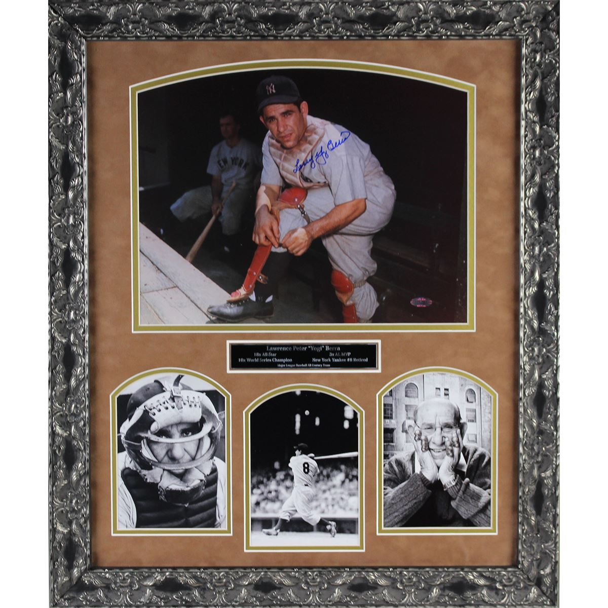 Yogi Berra Signed 4 Photo Collage w/ Nameplate - Signed Larry “Yogi” Berra (18x22 Frame)