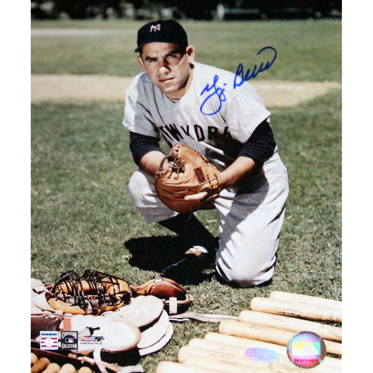Yogi Berra Signed Kneeling by Equipment Color Vertical 8x10 Photo