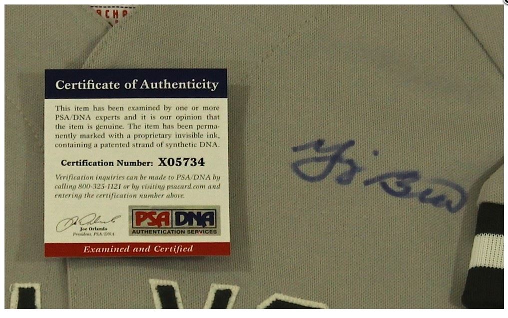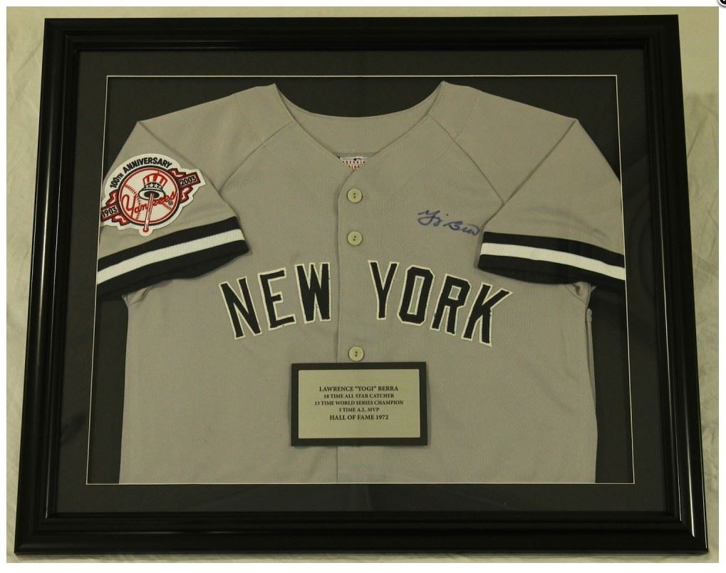 Yogi Berra Signed Yankees 23x27 Custom Framed Jersey Display (PSA COA) Custom framed display measures 22" x 27" in size and features an on-field style jersey with everything sewn on. Jersey has been hand-signed in blue felt-tip pen by Yogi Berra (HOF). The autograph includes an official PSA/DNA hologram and matching COA for authenticity purposes.
