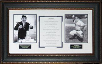 Yogi Berra played on 10 World Series championship teams and appeared in 14 World Series with the New York Yankees. Berra was selected to the All-Star team every year from 1948 to 1962 and was a three-time American League MVP. He called three no-hitters, one of them Don Larsen's perfect game in the 1956 World Series. Yogi is perhaps one of the most quoted personalities of our time. From media icons to Presidents, Yogi's saying have crept into our lives and surround us. Some of his utterances that created the phrase " Yogi-isms". This 2 Photo 34X21 includes a list of his most popular "Yogi-isms" Custom Matted and Premium Black Leather Framing as shown.