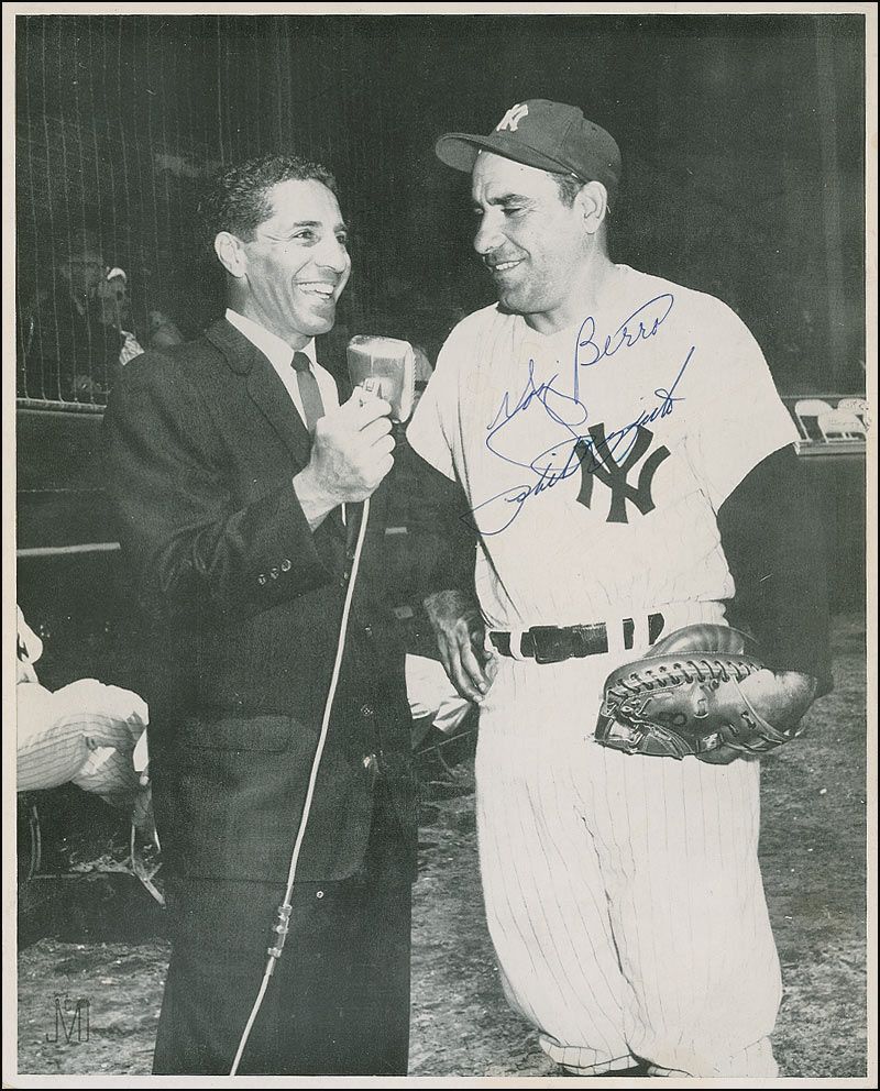 Vintage 8 x 10 cardstock photo of Rizzuto interviewing Berra before a game, signed in blue ballpoint by Yogi Berra and Phil Rizzuto. Some scattered light creases and surface marks and a small ding to lower portion of image, otherwise fine condition.