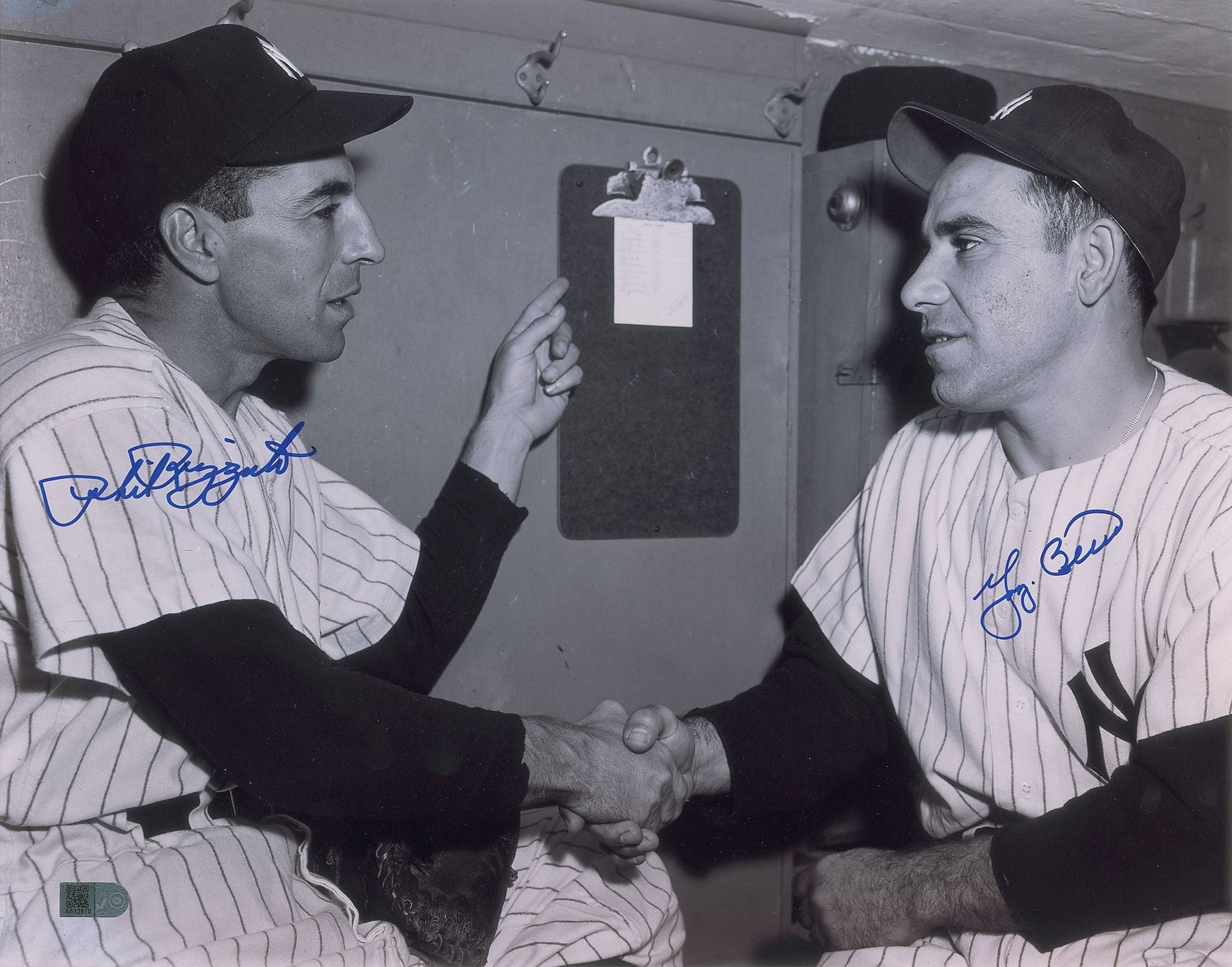 Satin-finish 14 x 11 photo of New York Yankees teammates Yogi Berra and Phil Rizzuto shaking hands in the dugout, signed by both in blue felt tip. In very fine condition, with an authenticity label affixed to lower left corner.