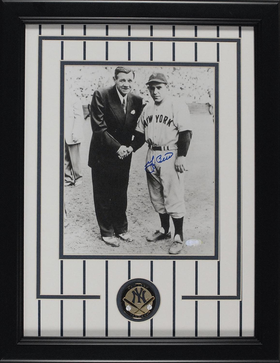 Glossy 8 x 10 photo of a young Berra shaking hands with Babe Ruth, signed in blue felt tip. Double matted and framed with a Yankees pin to an overall size of 14.25 x 18.25. In very fine condition, with a Steiner hologram affixed to lower right.
