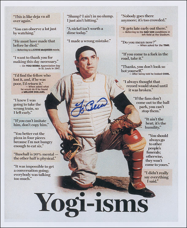 Color 8.75 x 10.5 laser print composite photo of Berra in his catching gear surrounded by ‘Yogi-isms,’ signed in blue felt tip. In fine condition.