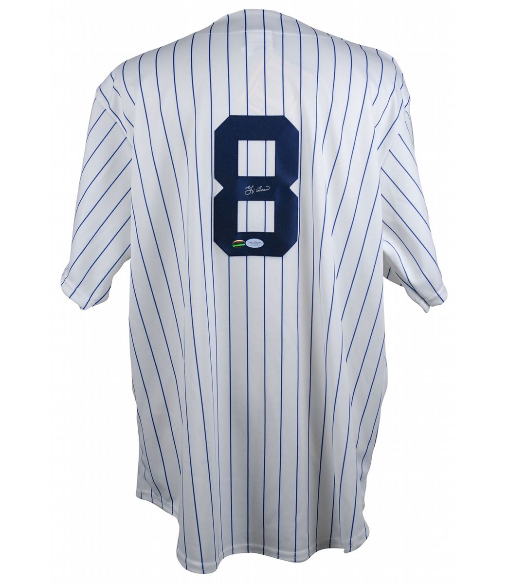 Official Majestic Cooperstown Collection replica New York Yankees baseball jersey, with sewn on letters and numbers, signed in silver ink on the number on the back. In fine condition, with a JSA label affixed to the number (certificate of authenticity not present).