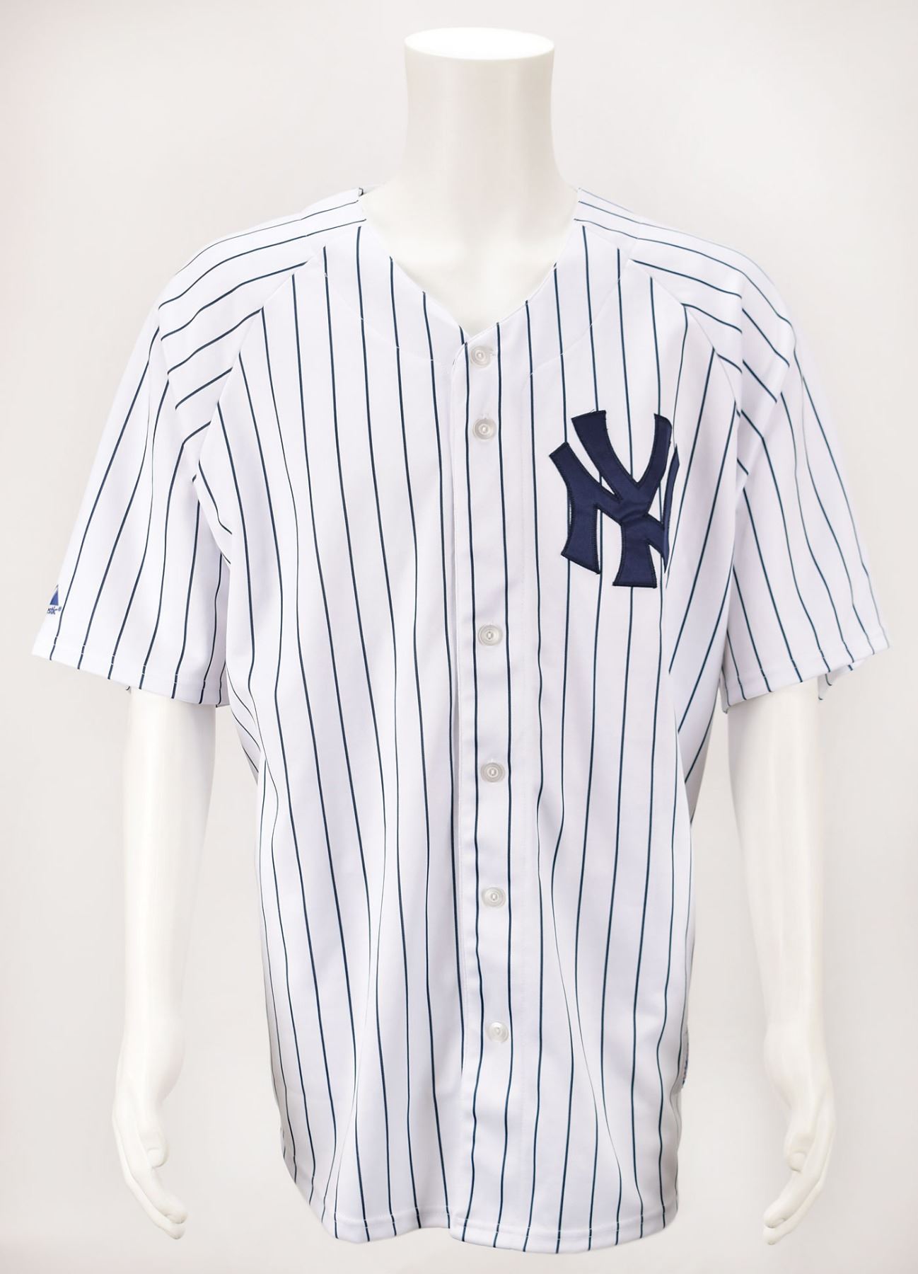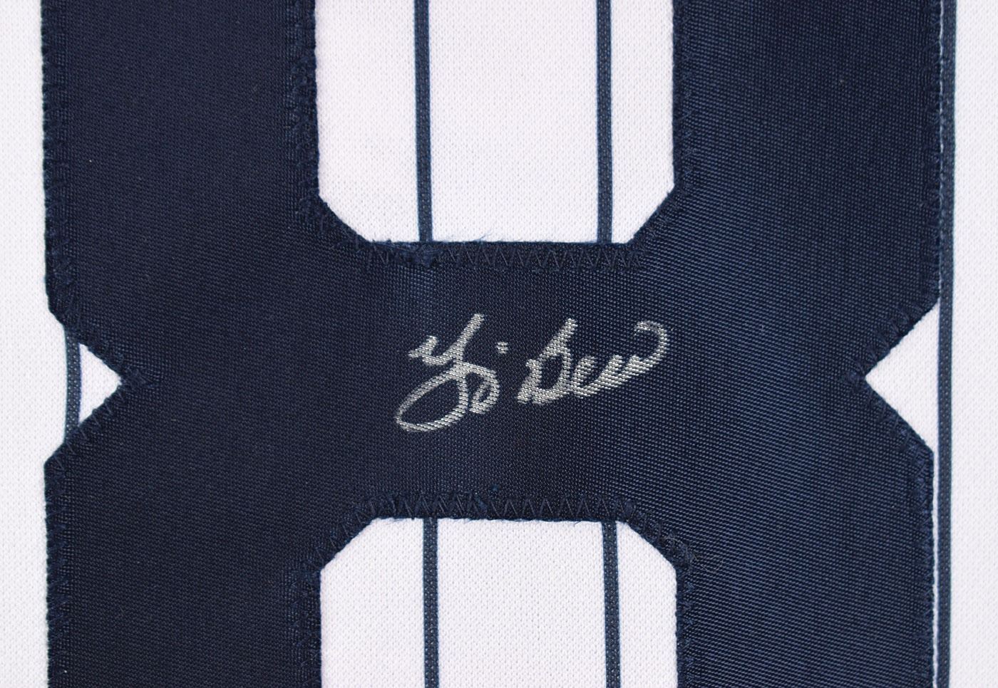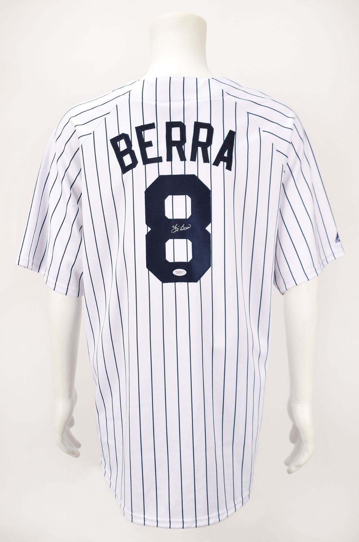 Official Majestic New York Yankees home baseball jersey, size 2XL, with sewn on letters and numbers, signed on the back "8" in silver ink by Yogi Berra. In fine condition. Accompanied by a certificate of authenticity from JSA.
