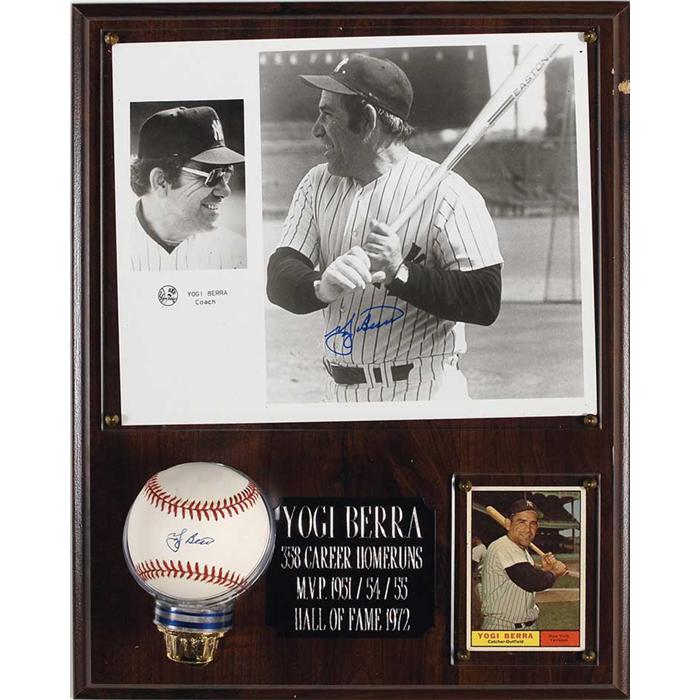 Glossy 10 x 8 photo of Berra in his Yankees uniform, signed in blue felt tip; an official Rawlings American League baseball, signed on the sweet spot in blue ballpoint and an original unsigned 1961 Topps card. All three are incorporated into a wooden plaque display to an overall size of 15 x 12. In fine condition, with a noticeable chip to the top right edge of the display. Pre-certified Steve Grad/PSA/DNA and RRAuction COA.