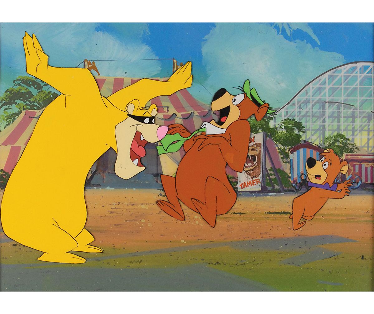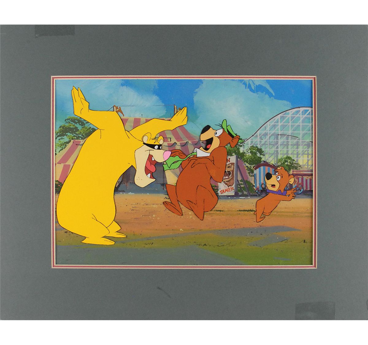 (Hanna-Barbera Studios, Circa 1970s) Original production cel featuring Yogi and Boo-Boo Bear from the Yogi Bear TV Show, showing Yogi and his buddy running scared from a big yellow bear. The cel is placed on a hand-painted amusement park background. Image measures 11 x 7.5, with a mat opening of 12 x 8.75. Mat dimensions are 17.5 x 14. In fine condition.