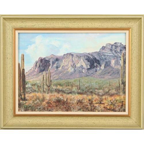The heat of the midday sun is accurately portrayed in this desert landscape. The warmth of the yellows and reds is not so much that it overwhelms the viewer however, for it is tempered with the cool blues and purples of the sky and cliffs in the distance. An eye-catching rendering that measures 8.5? x 11.5? is made even more attention-grabbing by the handsome ivory and gold colored wood frame. The total size of the image is 12? x 15?, and is waiting for a location to display its striking beauty.