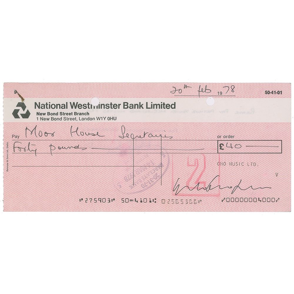 Ono Music Ltd. business check, 8 x 3.5, filled out in another hand and signed by Ono, "Yoko Ono Lennon," payable to Moor House Secretaries for £40, February 20, 1978. In fine condition, with a staple to the upper left corner, and two punch holes to the top edge. Accompanied by a certificate of authenticity from Tracks.