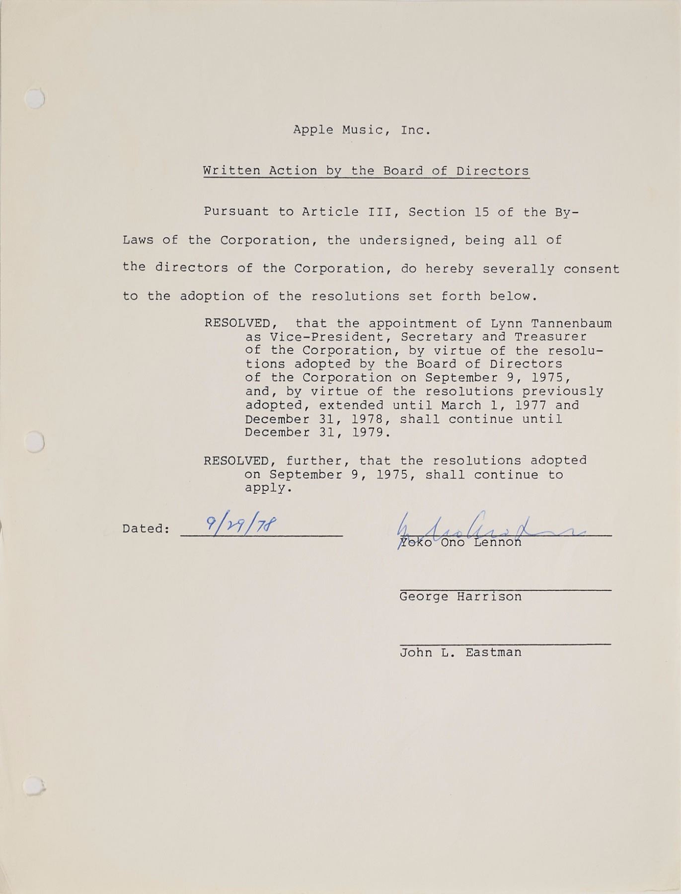 DS signed “Yoko Ono Lennon,” one page, 8.5 x 11, September 29, 1978. A resolution from the Apple Music board of directors, affirming "the appointment of Lynn Tannenbaum as Vice–President, Secretary and Treasurer of the Corporation." Signed at the conclusion in ballpoint by Ono. In fine condition.