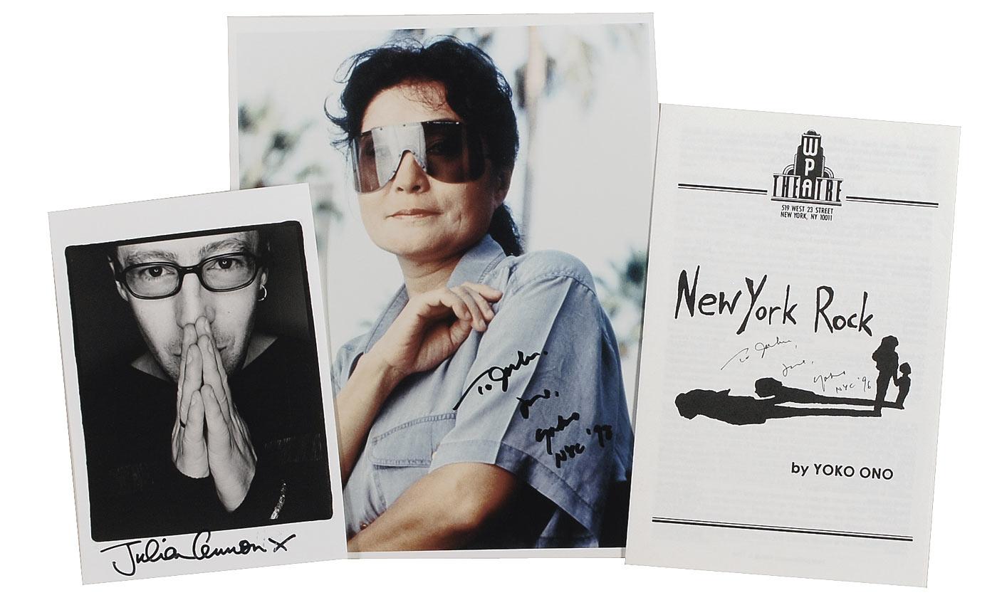 Three items: a color glossy 8 x 10 photo of Yoko Ono wearing sunglasses, signed and inscribed in black felt tip, “To John, Love, Yoko NYC ‘98”; a program from Yoko’s play, ‘New York Rock,’ eight pages, 5.5 x 8.5, signed and inscribed in black felt tip, “To John, Love, Yoko NYC ‘96”; and a glossy 5 x 7 photo of Julian Lennon with his hands clasped signed in black felt tip, “Julian Lennon X.” In fine condition, with a few faint ink marks at the end of Julian’s name.