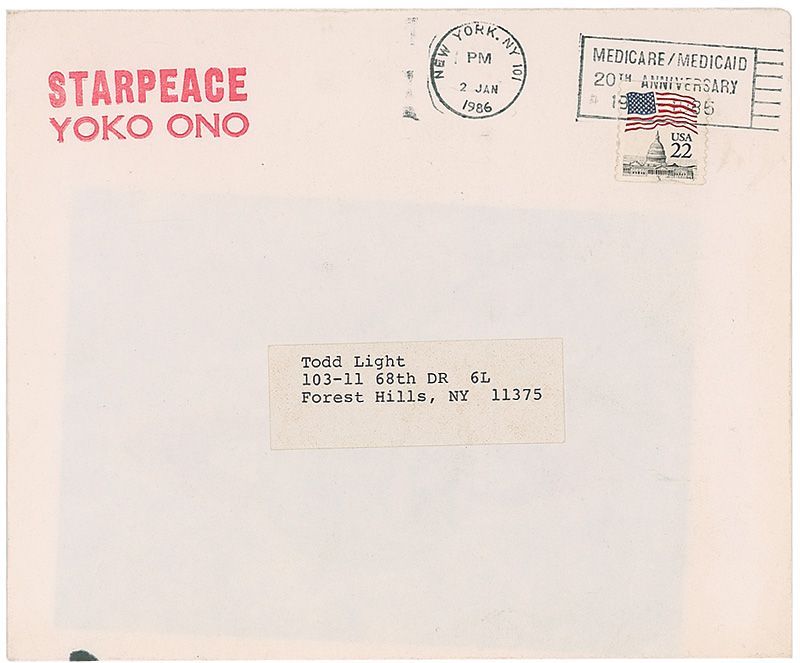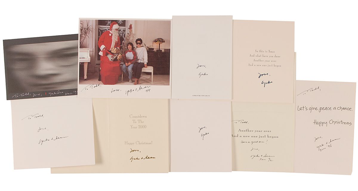 Collection of nine Christmas cards from various years, ranging in size from 4.5 x 6.25 up to 7 x 6, three signed “Yoko,” one signed “Yoko Ono,” and five signed “Yoko & Sean.” In fine condition.