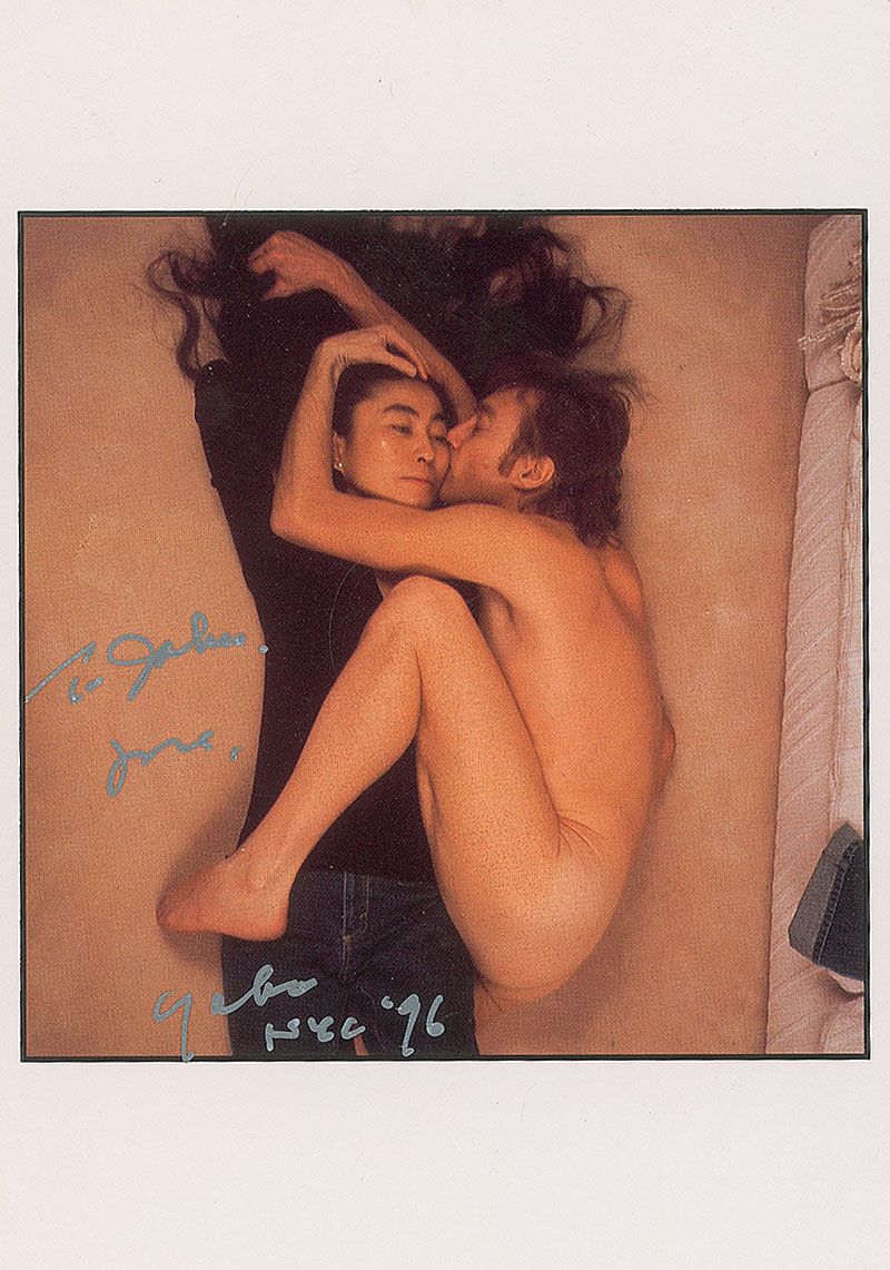 Famous color glossy 4 x 6 postcard photo (taken by Annie Leibowitz) of Ono being embraced by the nude and fetal Lennon, signed and inscribed in silver ink, “To John, Love, Yoko NYC ’96.” In fine condition.