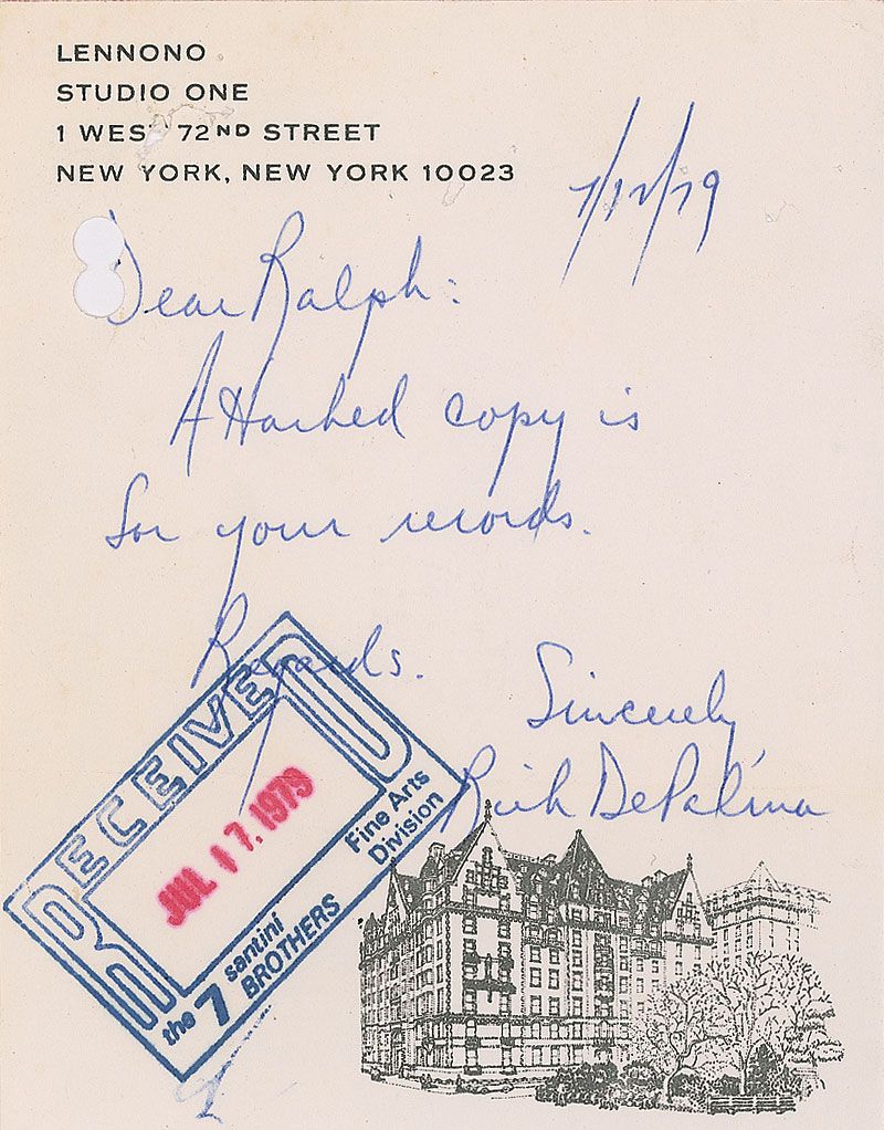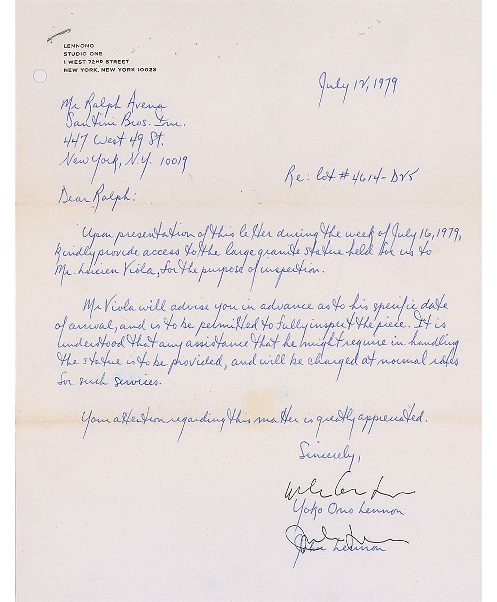 LS signed “Yoko Ono Lennon and John Lennon,” all in Ono’s hand, one page, 8.5 x 11, Lennono letterhead, July 12, 1979. Letter written in the hand of Rich DePalma, the Lennons’ business administrator to Ralph Avena, of Santini Bros., New York. In full: “Upon presentation of this letter during the week of July 16, 1979, kindly provide access to the large granite statue held for us to Mr. Lucien Viola, for the purpose of inspection. Mr. Viola will advise you in advance as to his specific date of arrival, and is to be permitted to fully inspect the piece. It is understood that any assistance that he might require in handling the statue is to be provided, and will be charged at normal rates for such services. Your attention regarding this matter is greatly appreciated.” Signed at the conclusion by Ono, who also signs for her husband John Lennon. Intersecting folds, staple and staple holes to top edge, punch hole to top left and a few spots of mild toning, otherwise fine condition. Accompanied by a short note from DePalma to Ralph Avena.
