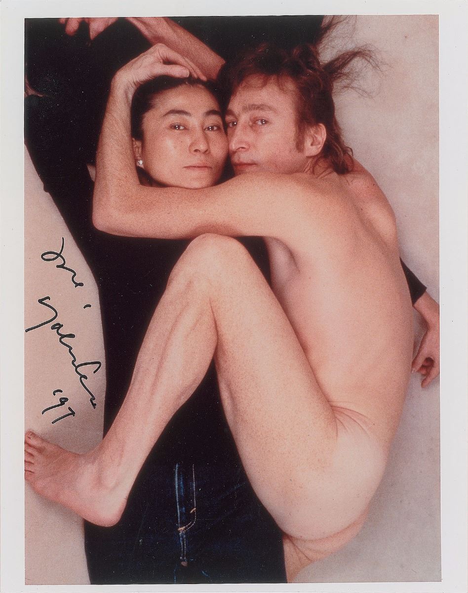 Color glossy 8 x 10 photo of the iconic image of Yoko Ono lying with a nude John Lennon, signed in black felt tip, "Love, Yoko One, '97." In fine condition.