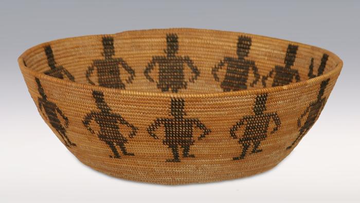 Yokuts Friendship Basket. 9 1/2" x 3 1/2". 13 head dressed dancing warrior figures. C. 1900. Condition Report: One stitch missing, otherwise in excellent condition.