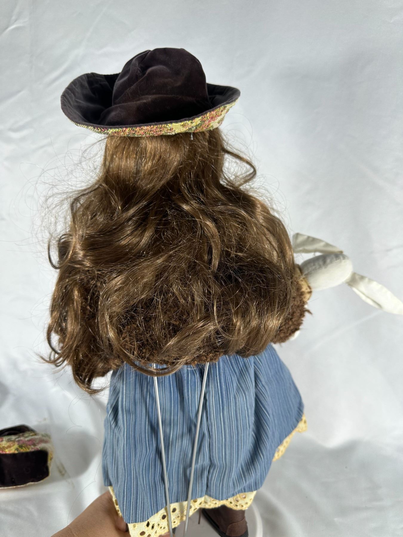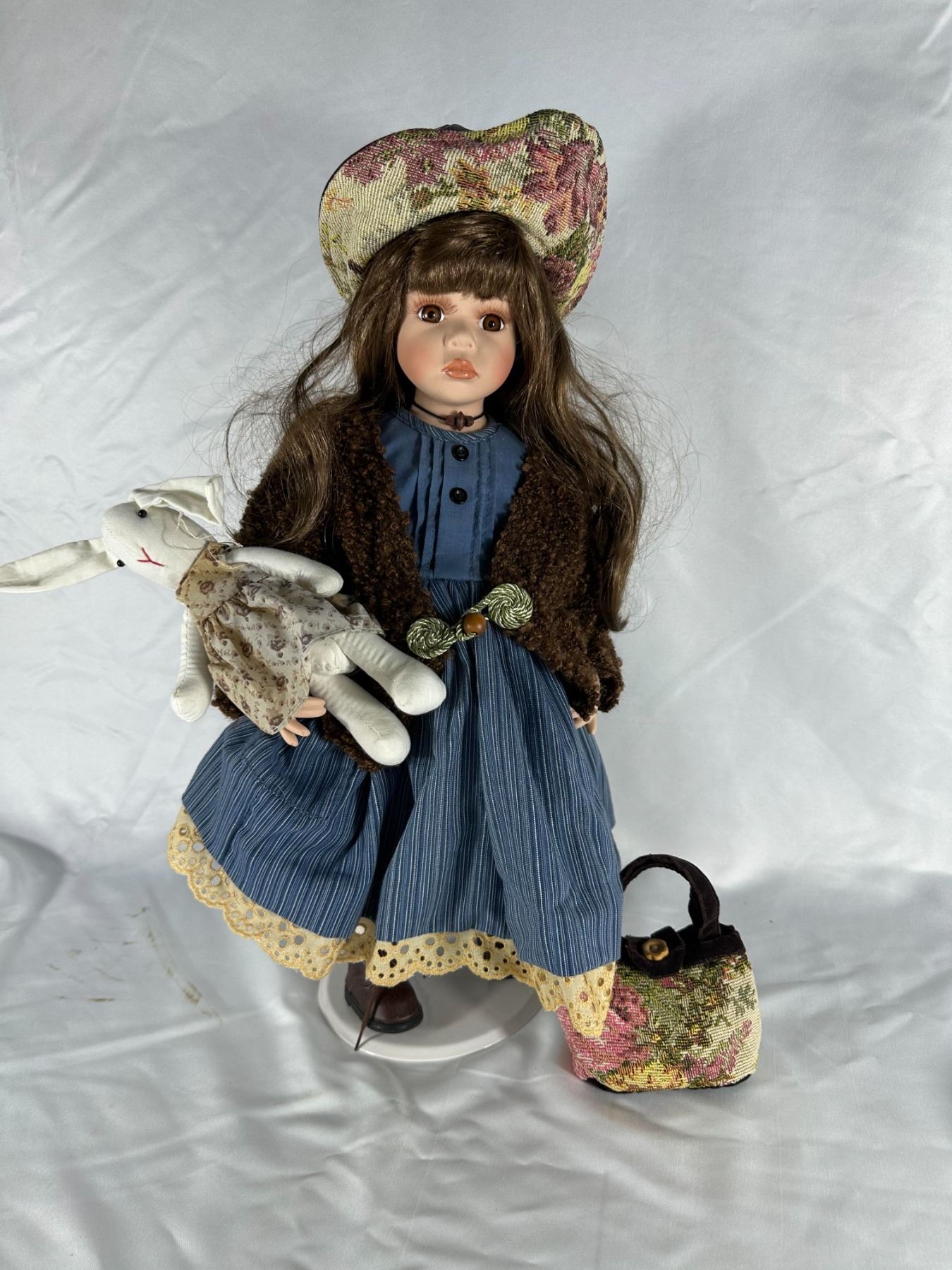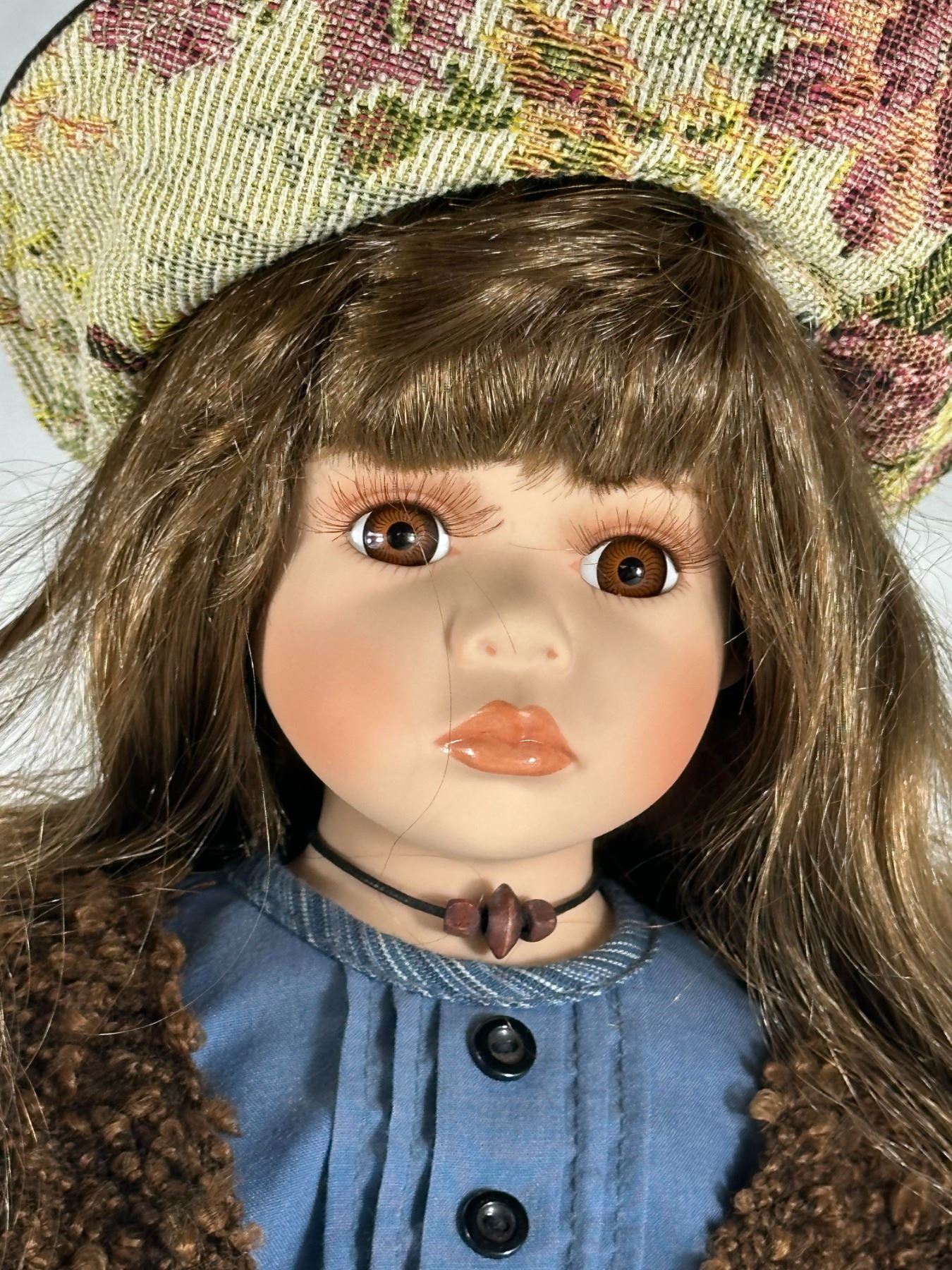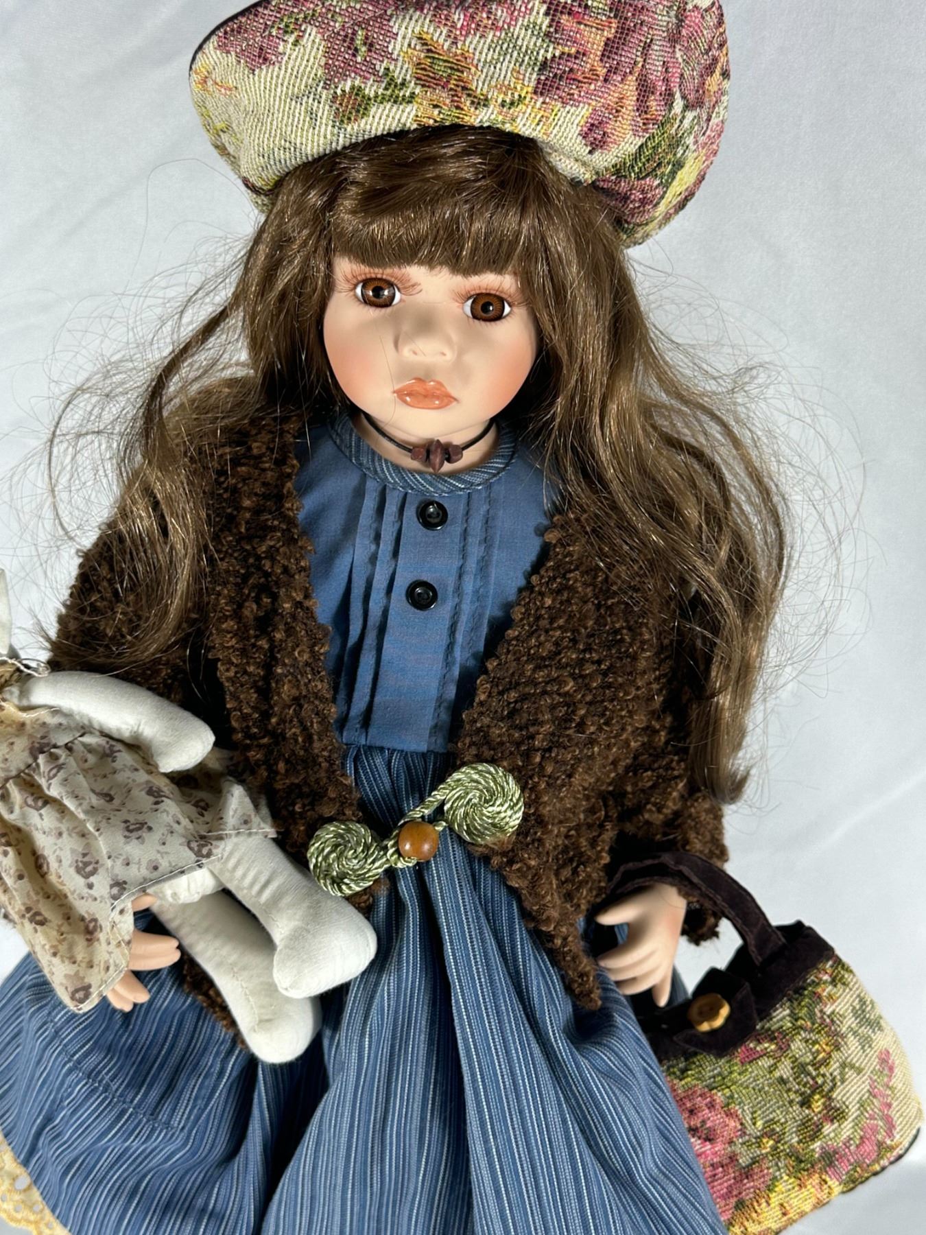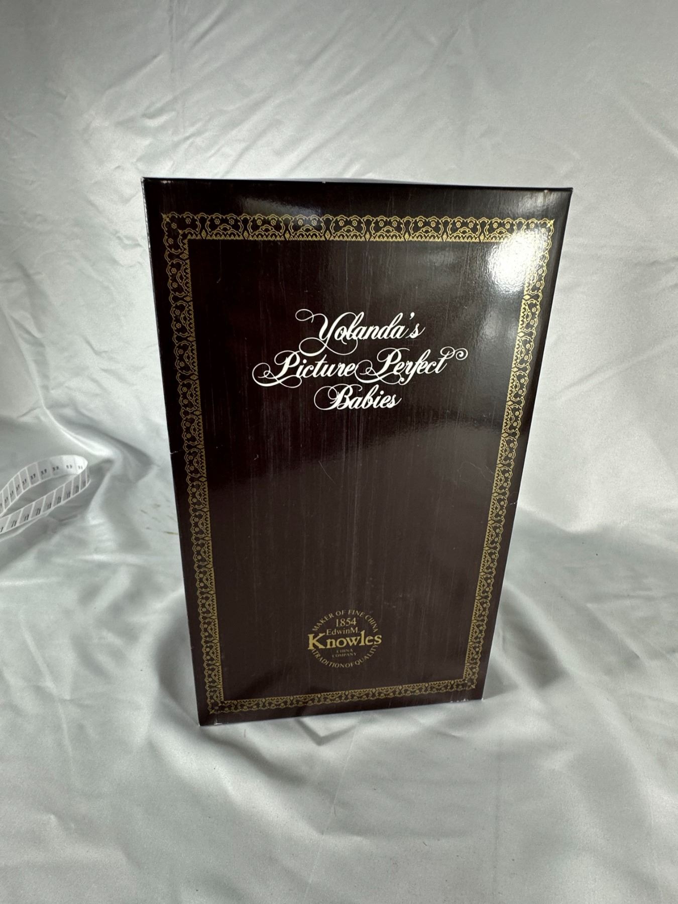 Porcelain doll from Yolanda Bello’s *Picture Perfect Babies* line by Edwin M. Knowles. Dressed in blue dress, brown jacket, floral tapestry beret with matching handbag, and holding a cloth doll accessory. Includes original box.