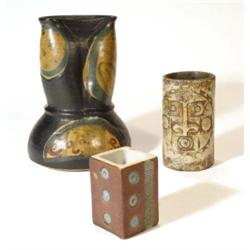 Yolande Bier Studio Pottery double Gourd shape vase, Troika style match striker, marked Tigi 63 to base and a Celtic style Studio Pottery vase, incised with a mask, Largest 20cm high