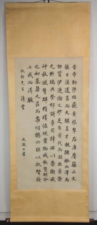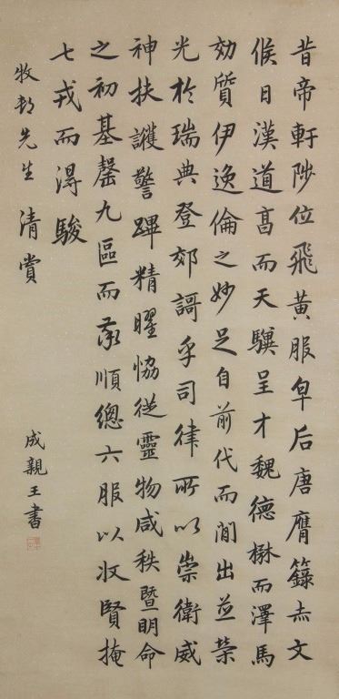 Chinese character calligraphy in regular script; Chinese ink on paper; hanging scroll; signed Yongxing (1752-1823), Qianlong's 11th son; inscribed with 1 artist seal; 132 cm x 67 cm