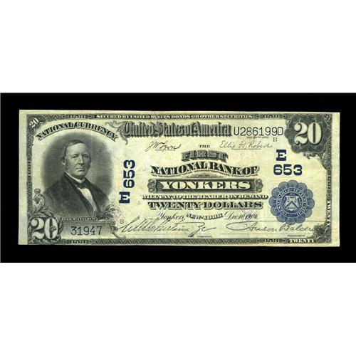 <B>Yonkers, NY</B></I> - $20 1902 Plain Back Fr. 650 <B>The First NB </B></I> Ch. # (E)653<BR>Though a trifle flat for the grade, this note has great color and stamped signatures. <B>Very Fine</B></I>.