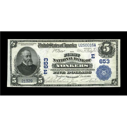 <B>Yonkers, NY</B></I> - $5 1902 Date Back Fr. 590 <B>The First NB </B></I> Ch. # (E)653<BR>This bank operated in Westchester County for almost seventy years. The note we offer here is completely original with pristine surfaces. <B>Choice Crisp Uncirculated.</B></I>